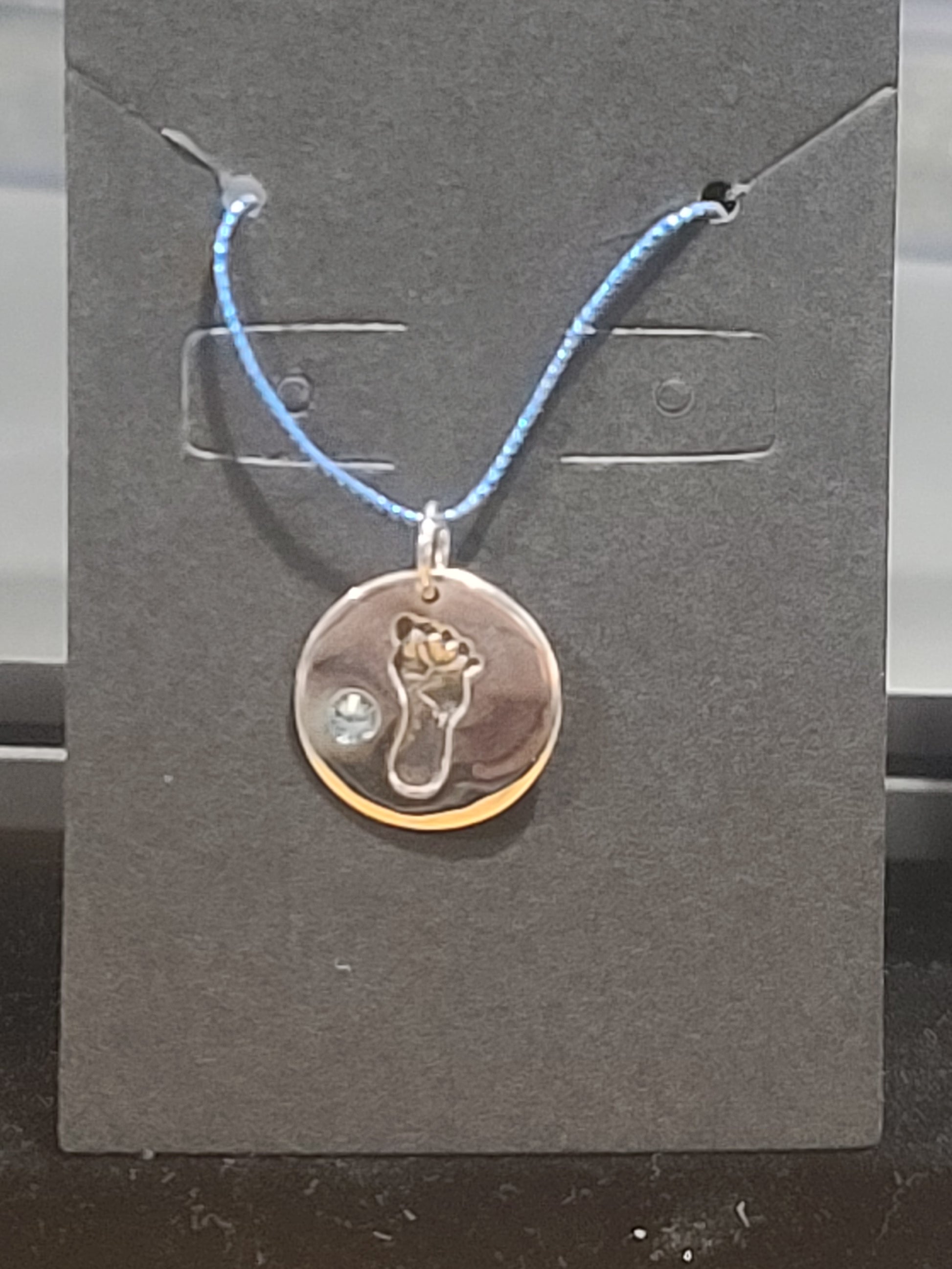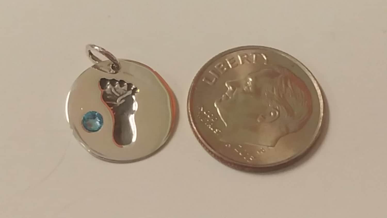 - Design: Baby footprint engraved on a disc charm, measuring approximately 14mm.