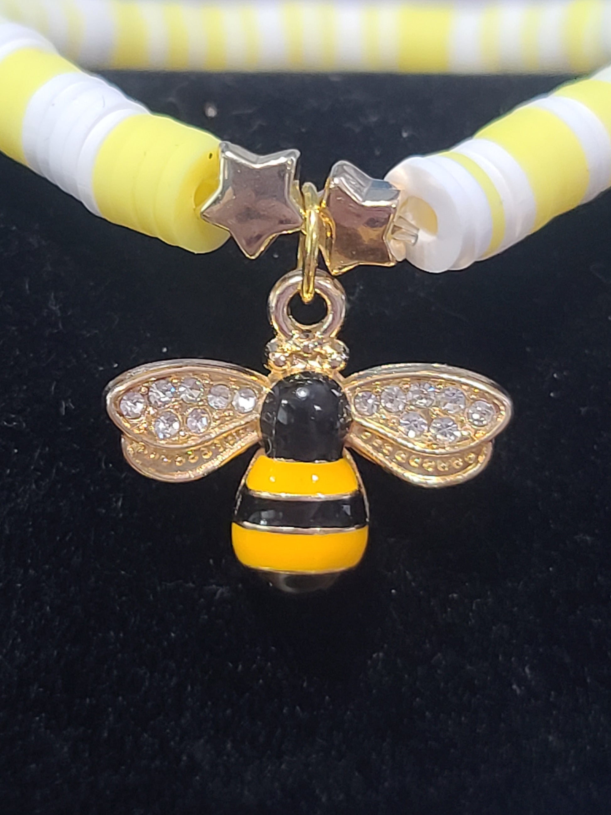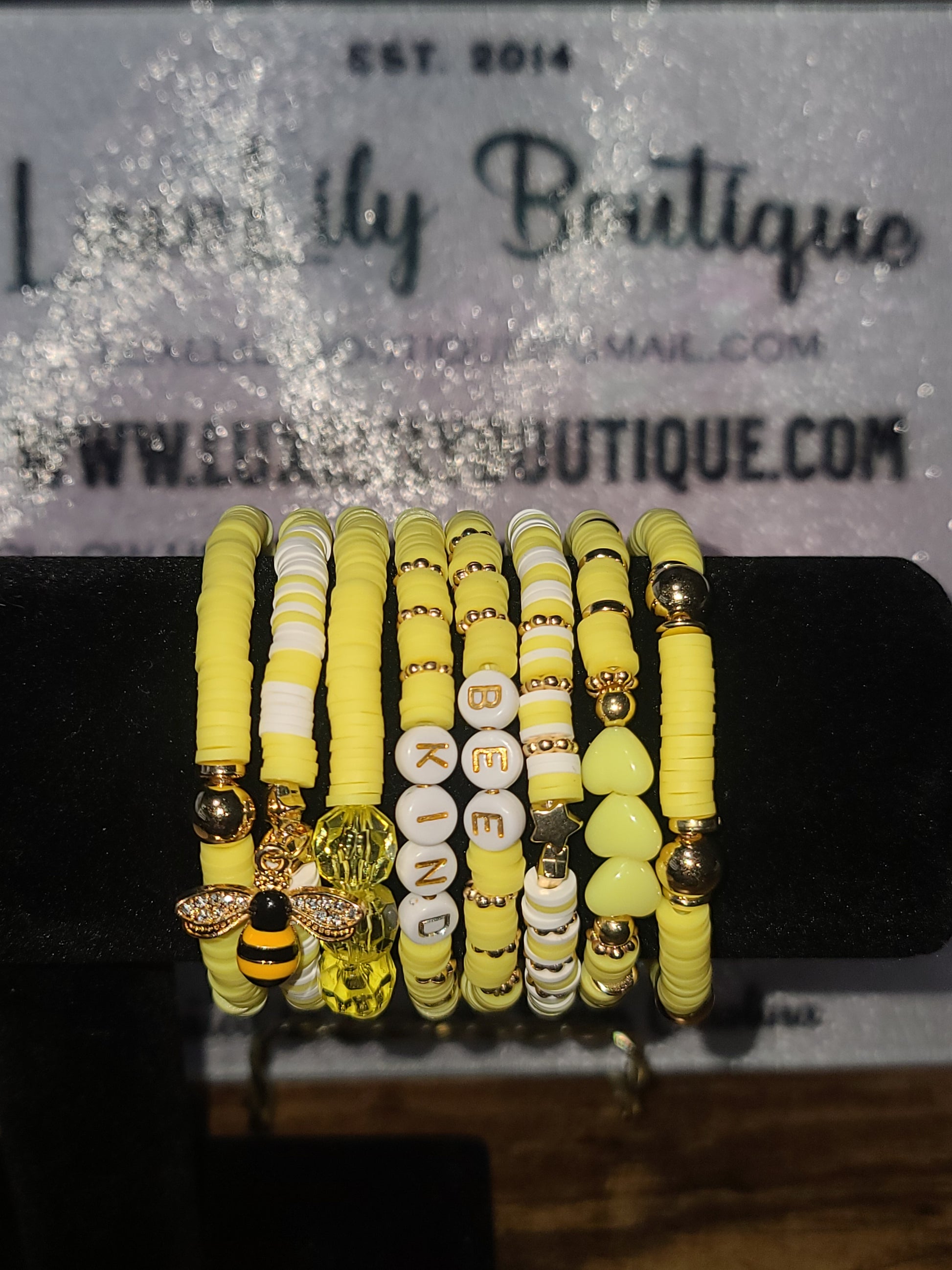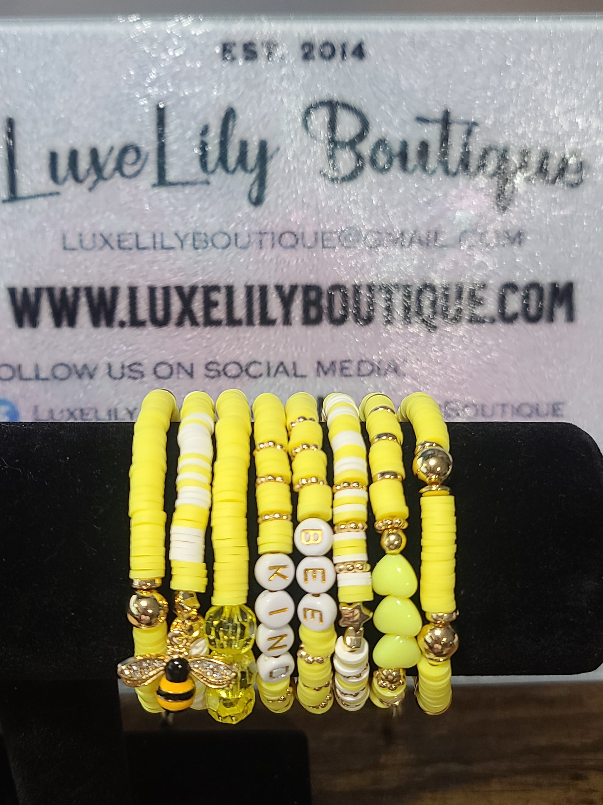 Bee Kind Set of 8 Yellow Bohemian Polymer Clay Bracelets with Bee Charm, Boho Style, Stackable Bracelet Set, Trending, Summer Jewelry