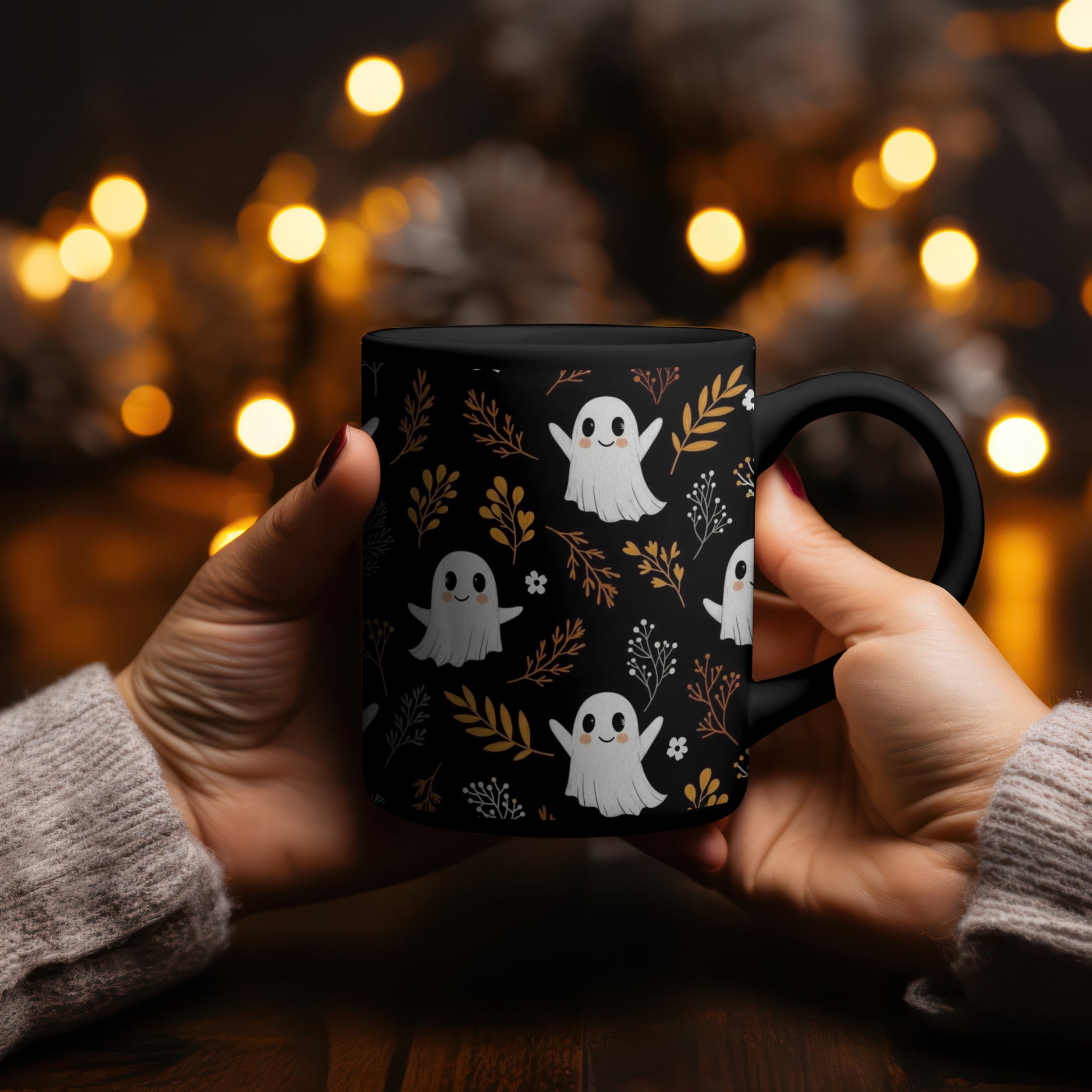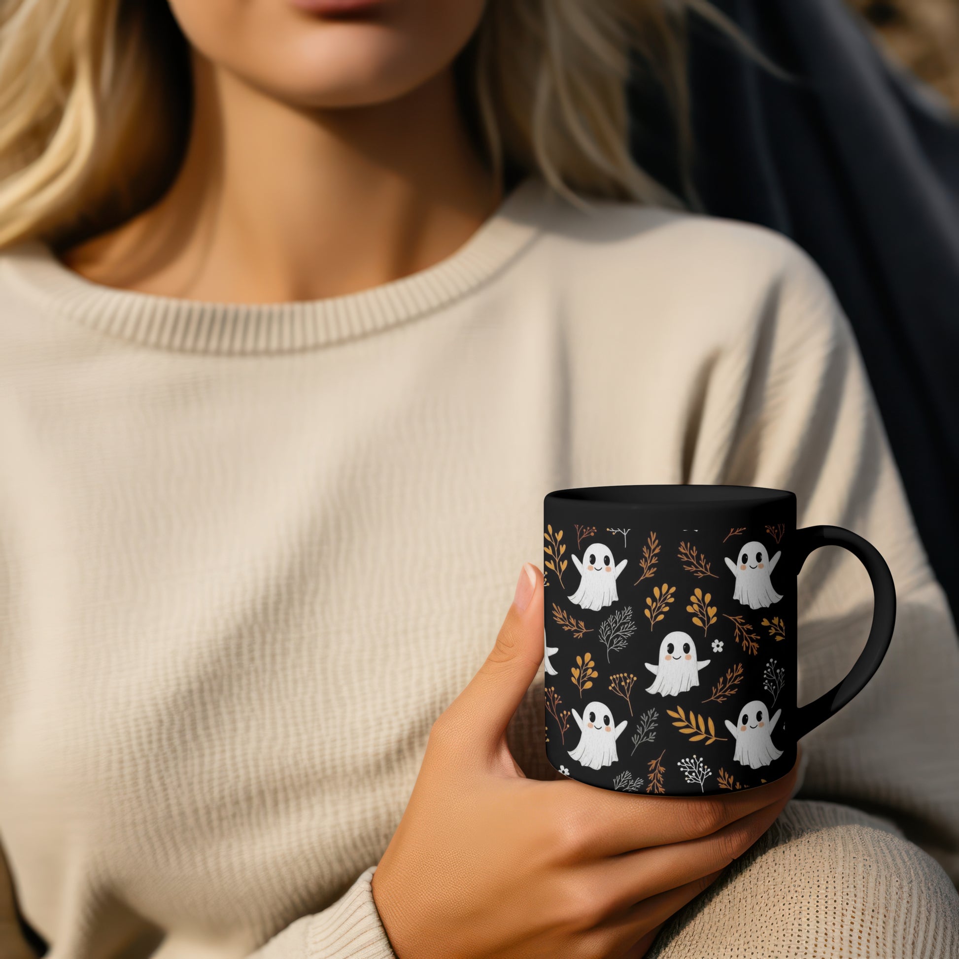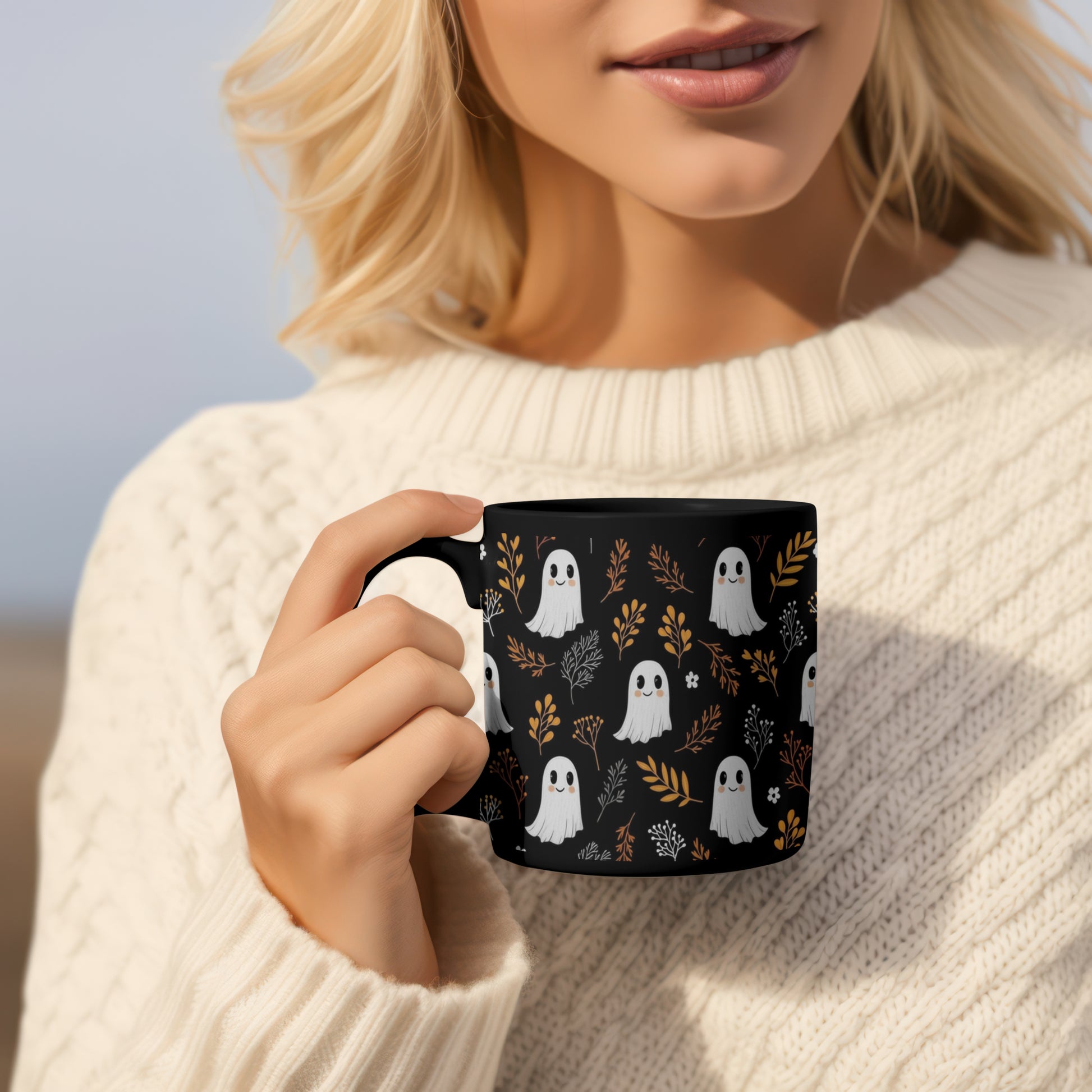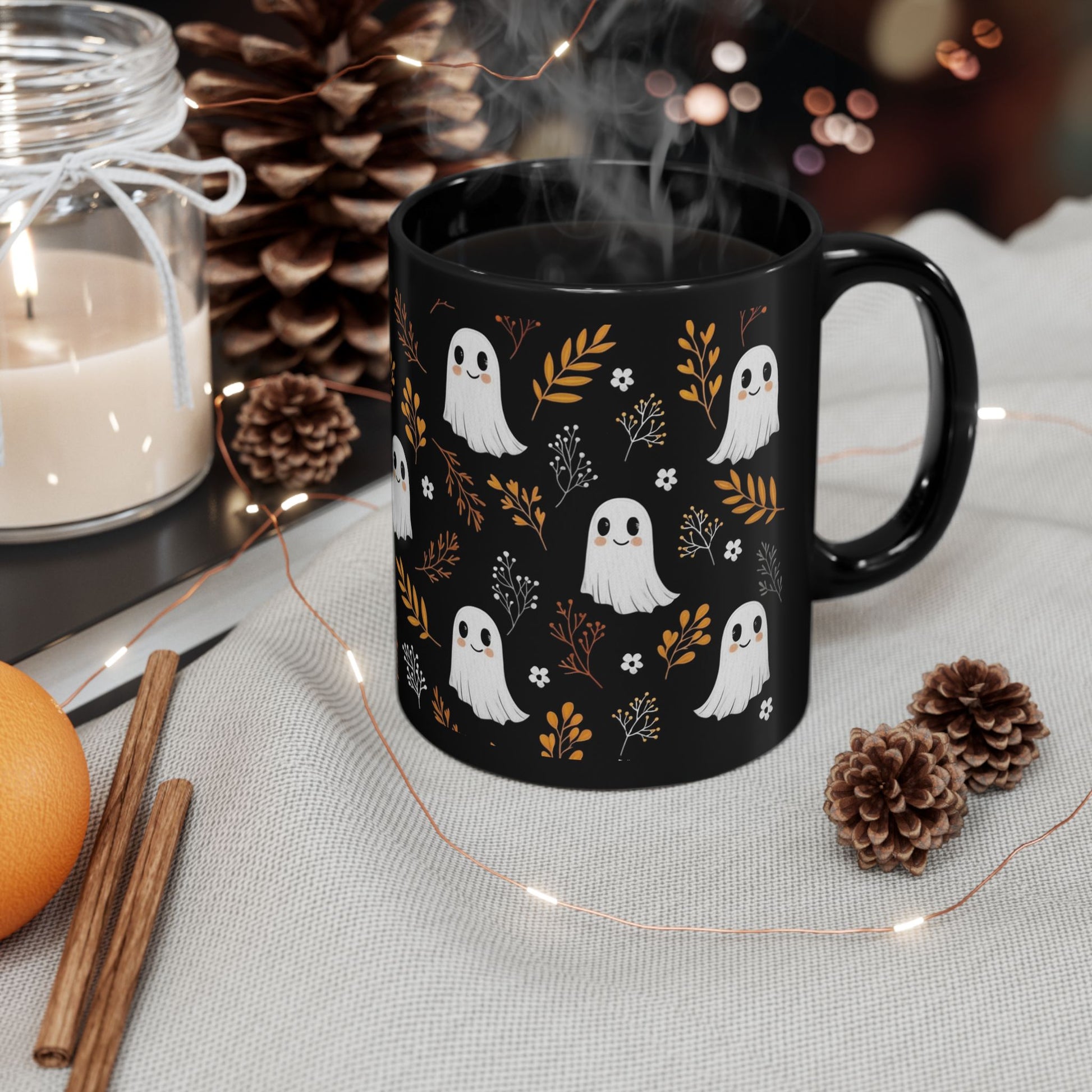 Sip your favorite fall drinks in style with this Black Ghost Halloween Mug in 2 designs! Featuring playful white ghost illustrations surrounded by fall-colored flowers and leaves in warm orange, yellow, and brown, this mug is perfect for cozy autumn vibes. Dual sided design.