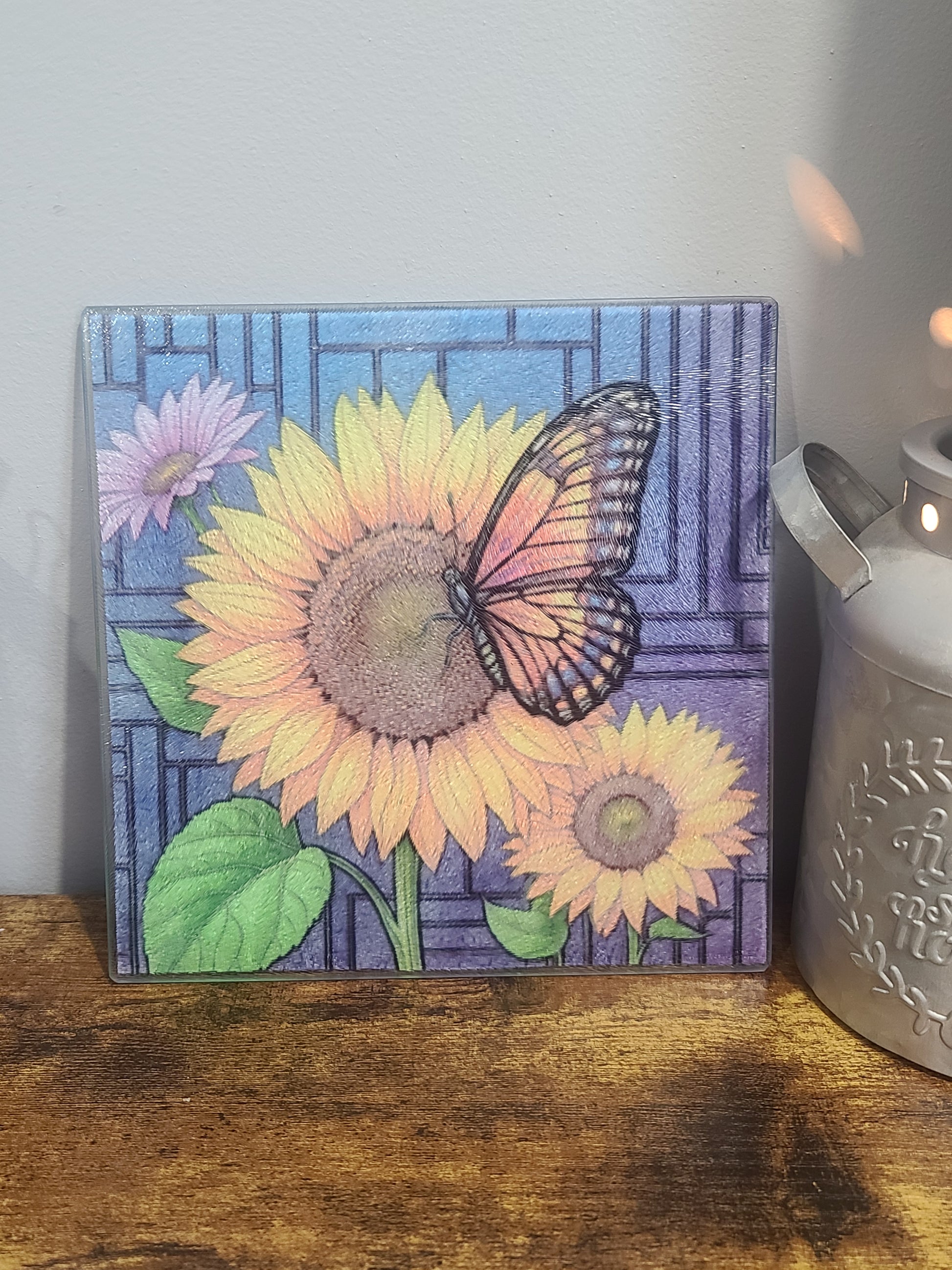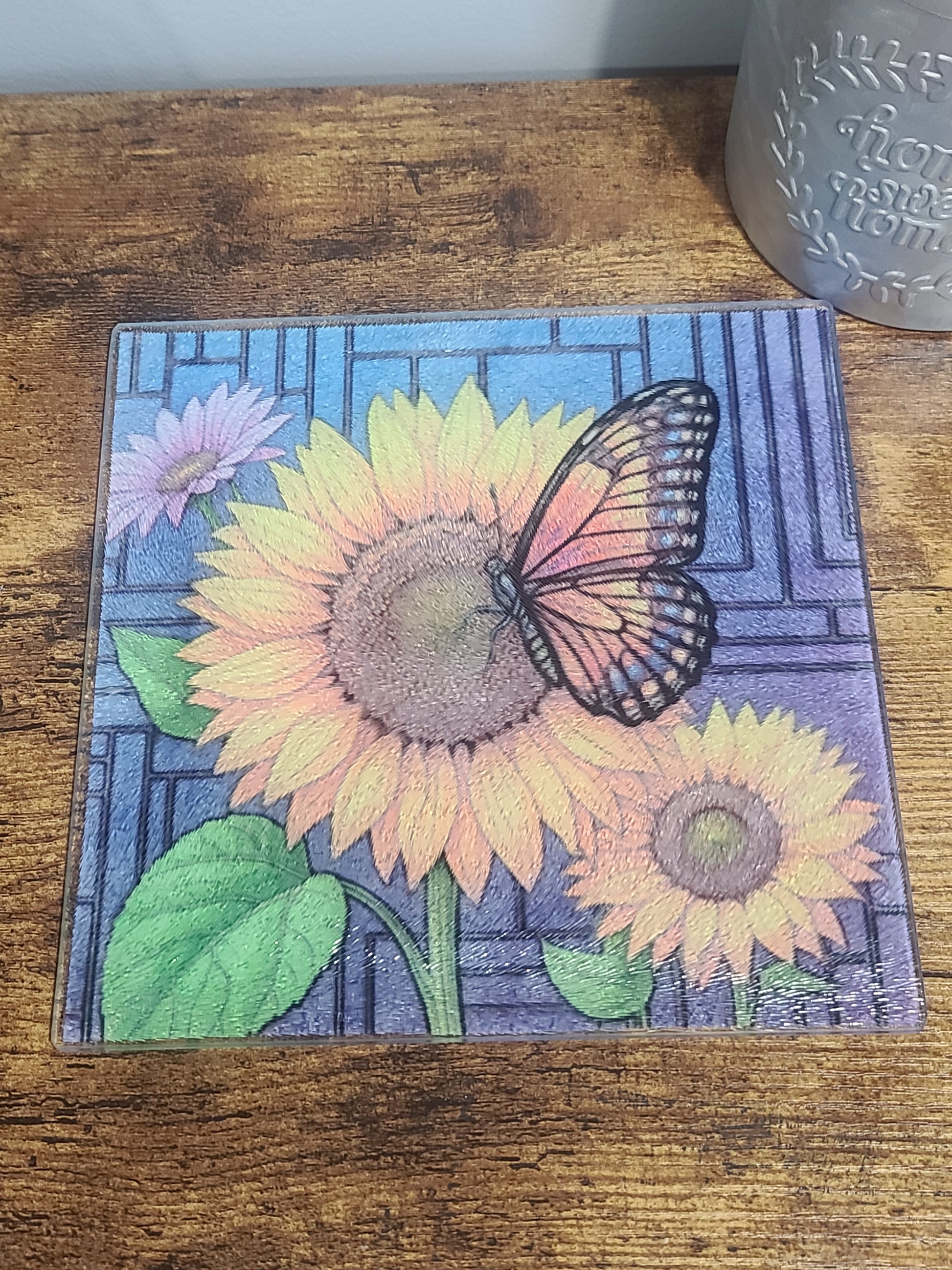 Handcrafted Butterfly and Sunflower Stained Glass Look Glass Trivet Cutting Board