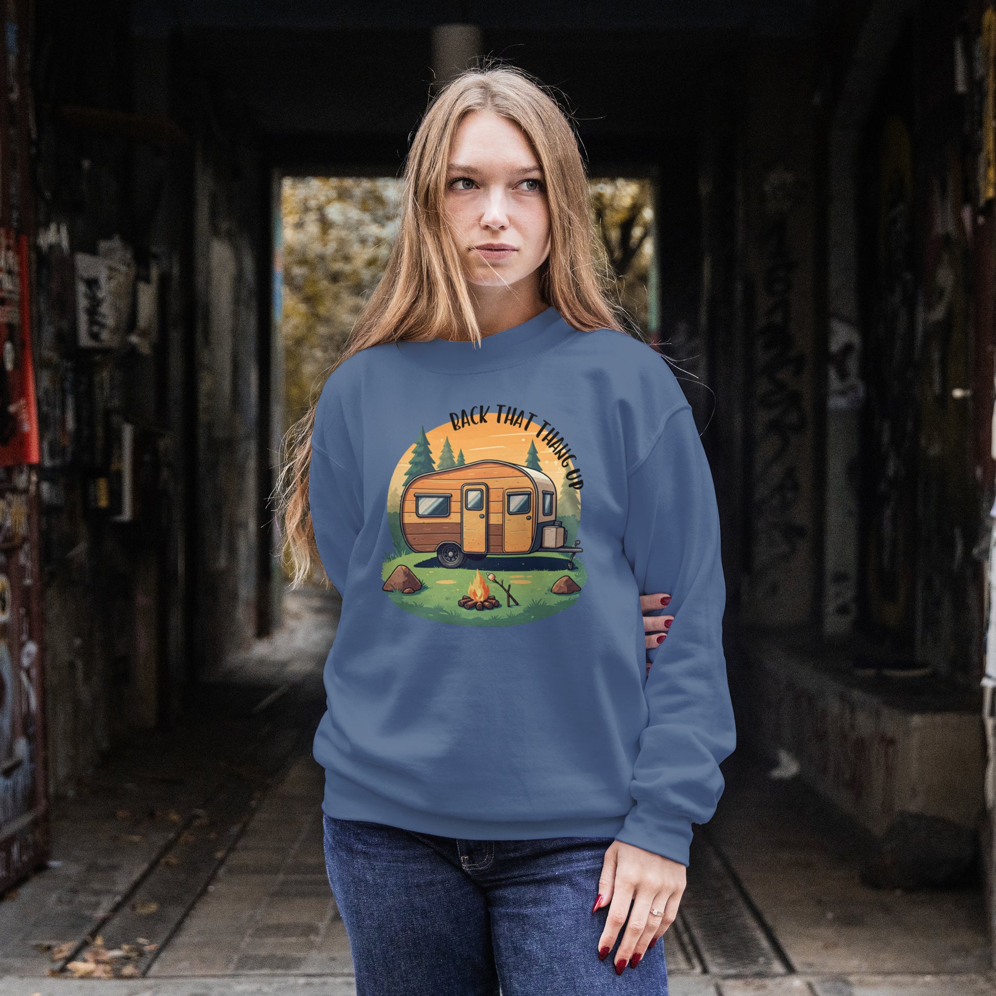 Whether you're parking your camper, setting up your tent, or just hanging by the fire, the "Back That Thang Up" Sweatshirt is the perfect way to show your camping spirit with a sense of humor. Made for chilly nights under the stars, this cozy unisex sweatshirt is a must-have for RV travelers, tent campers, and nature lovers alike.