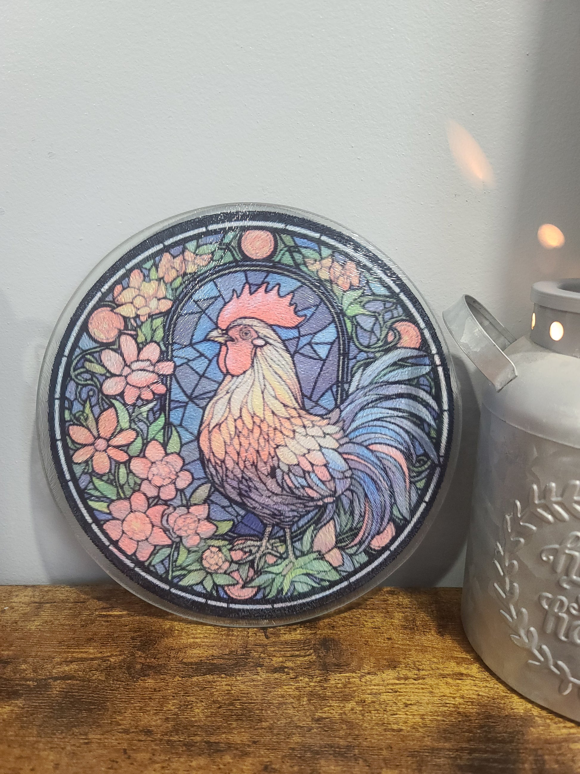 Handcrafted Rooster Stained Glass Look Glass Trivet Cutting Board