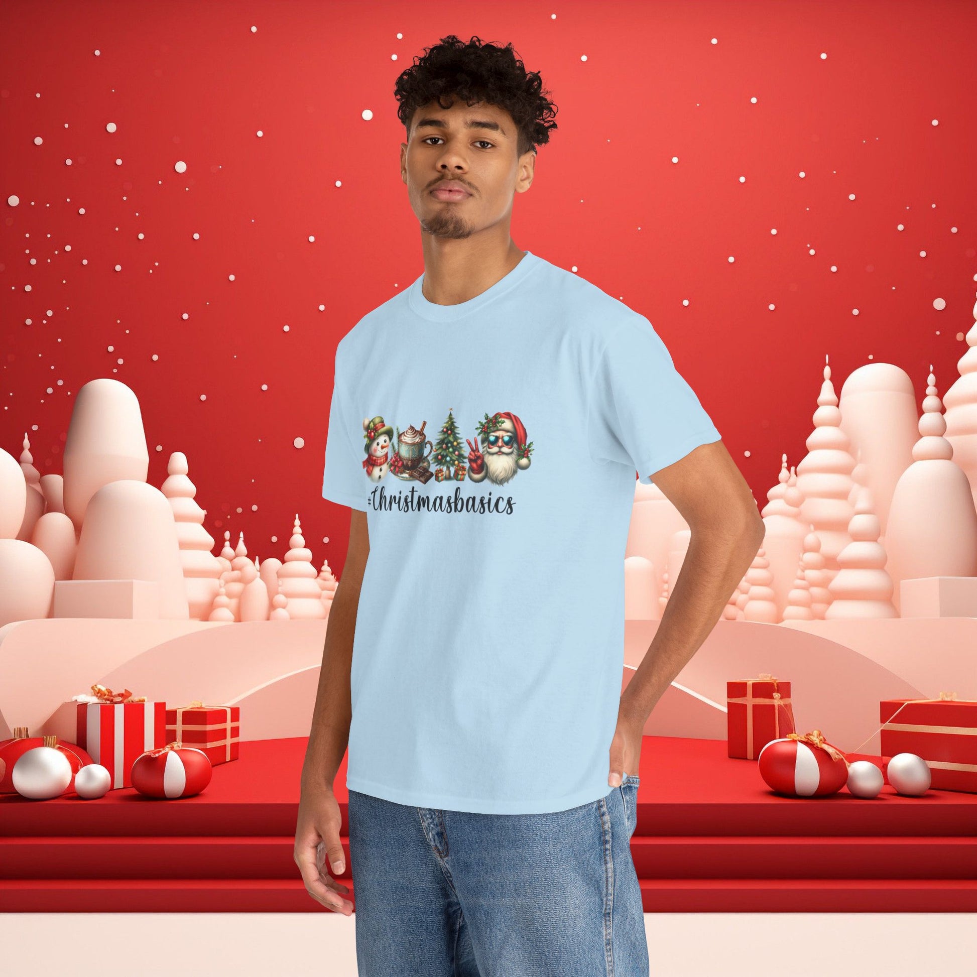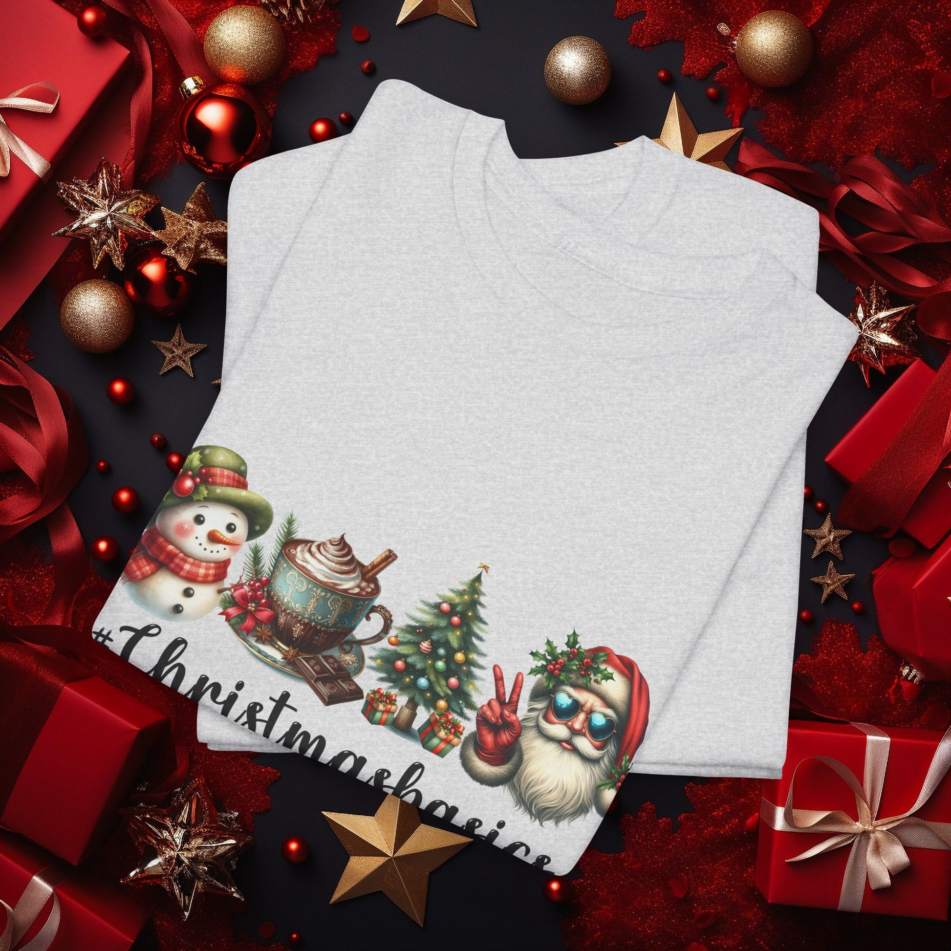 Vintage style Christmas Basics T-Shirt featuring a snowman, hot cocoa, Christmas tree, and Santa design. Perfect for the holiday season and Christmas celebrations. Ideal for those looking for a festive and cozy shirt to wear during Christmas gatherings and events.