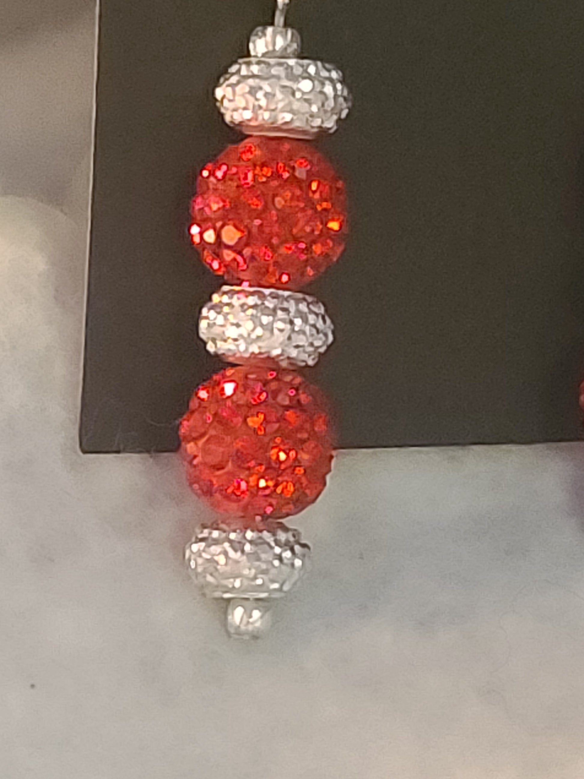These eye-catching earrings feature vibrant 10 mm beads encrusted with sparkling rhinestones that catch the light beautifully. The festive color palette of rich red and shimmering silver is perfect for adding a touch of glamour to your holiday attire. Earrings are made with 2 red rhinestone beads and 3 rondelle silver beads, on a French wire. Dangle is 4.5 cm from top bead.