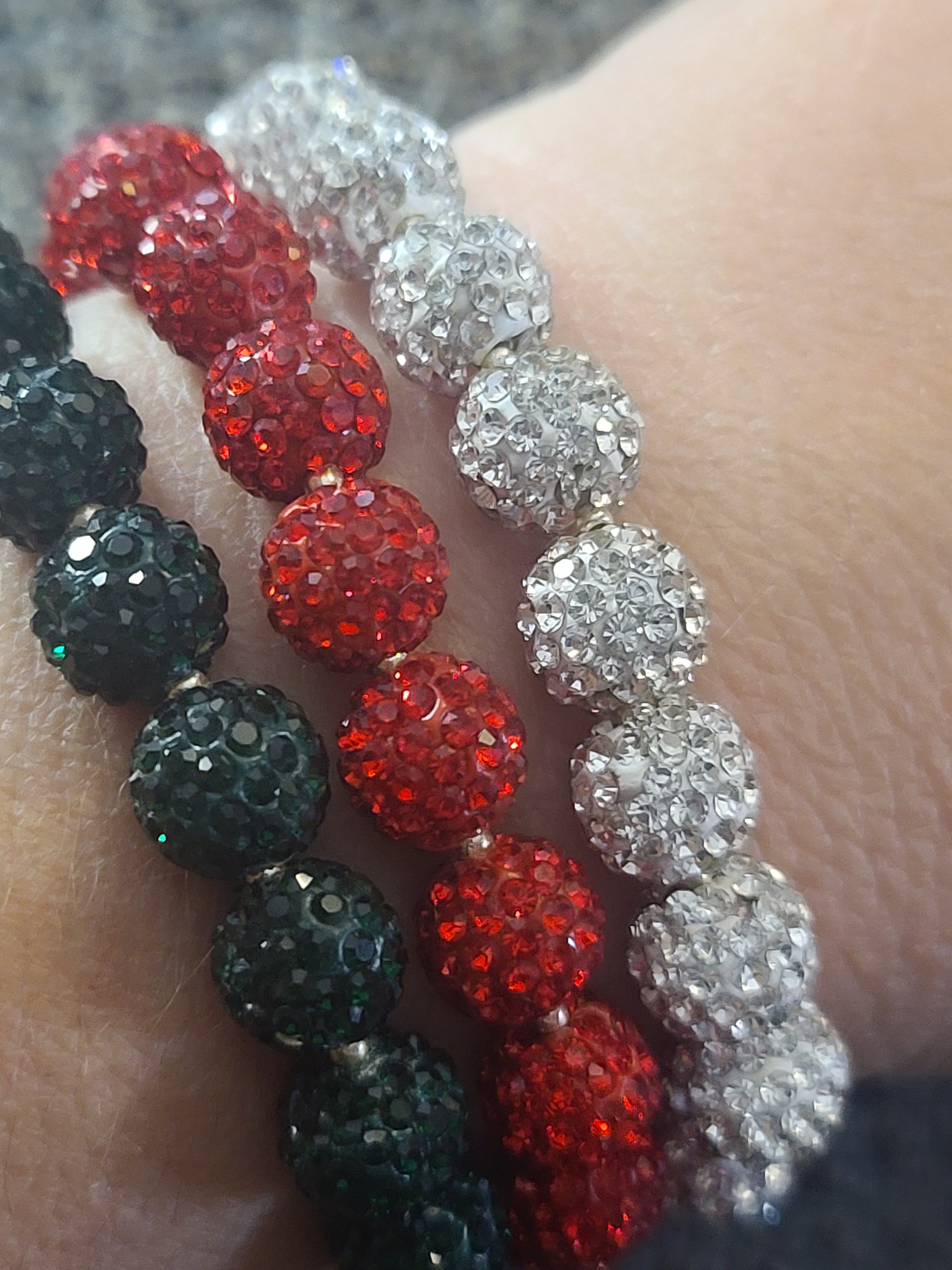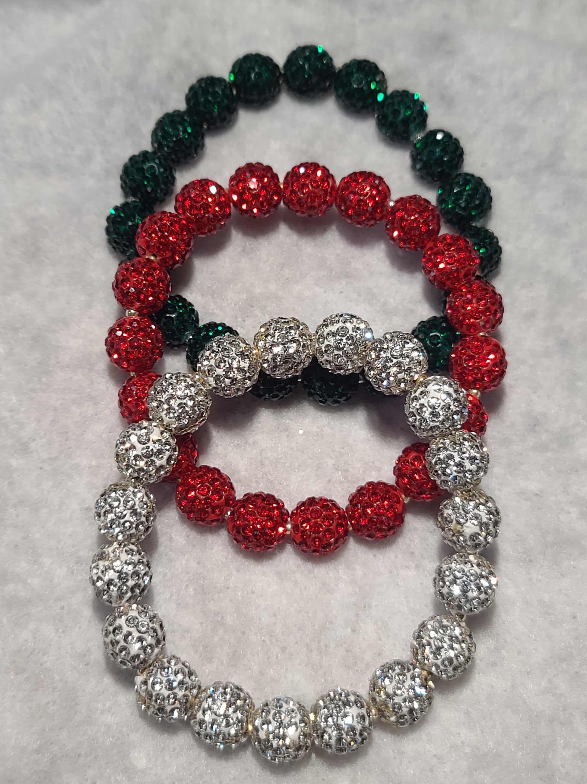 Three Strand Set of Christmas Bling Handmade Stretch Beaded Bracelets - Red, Green, Silver