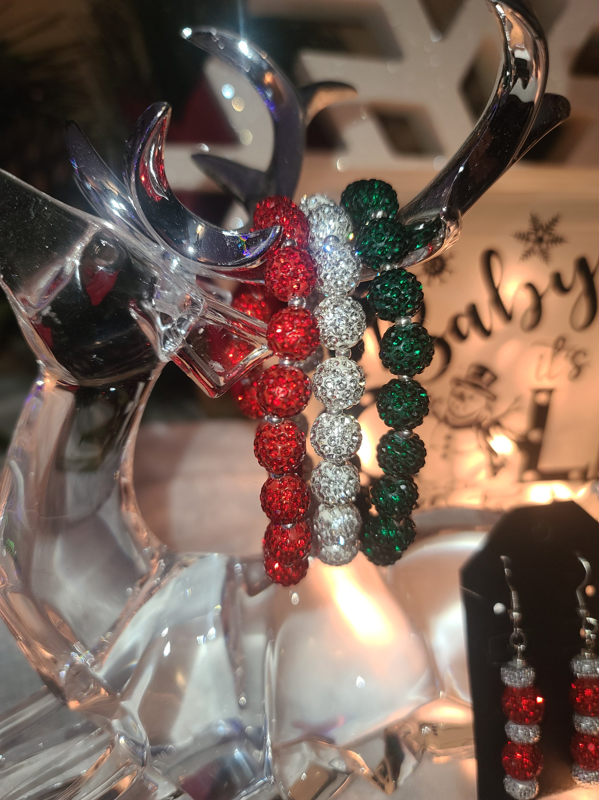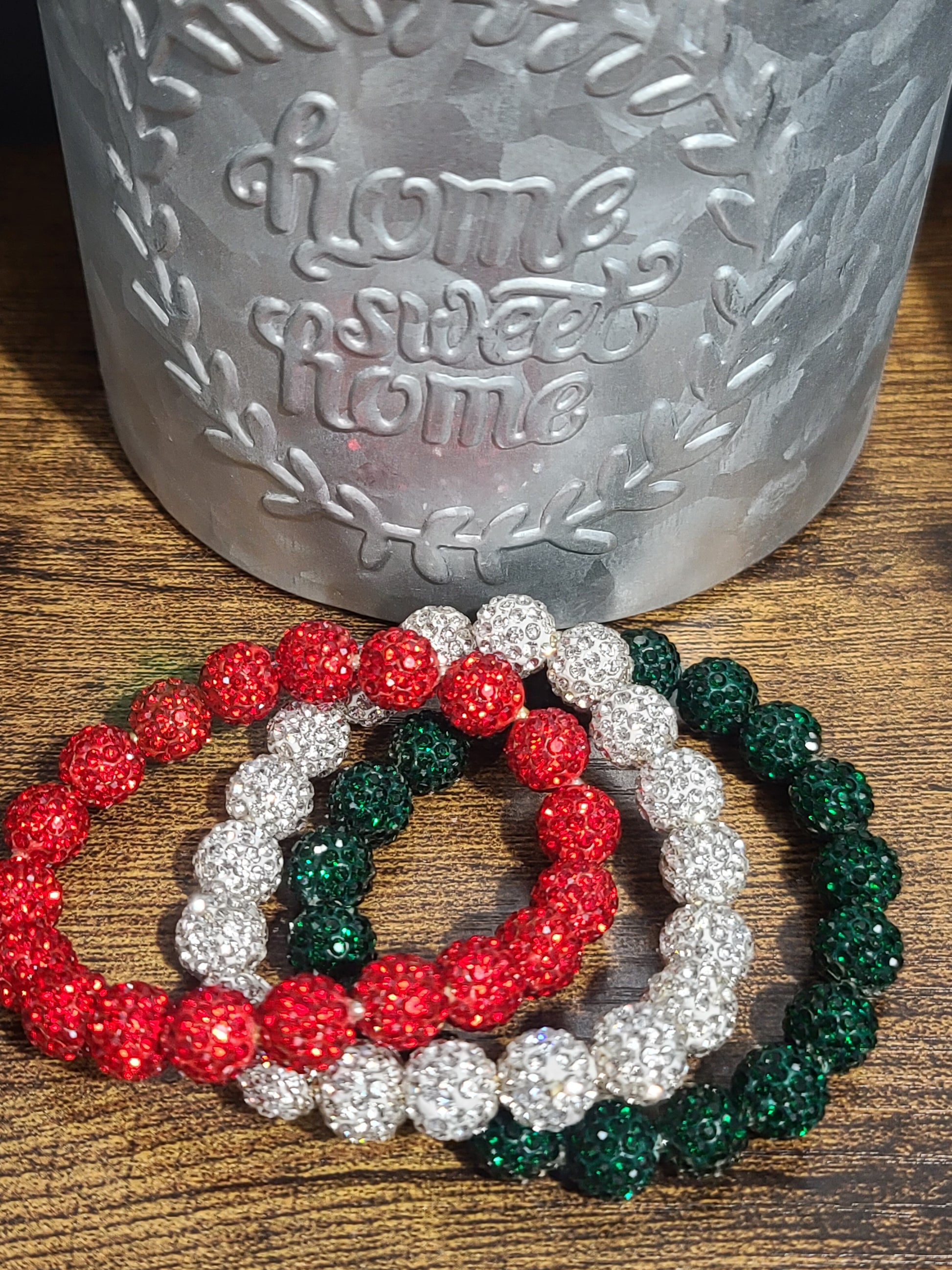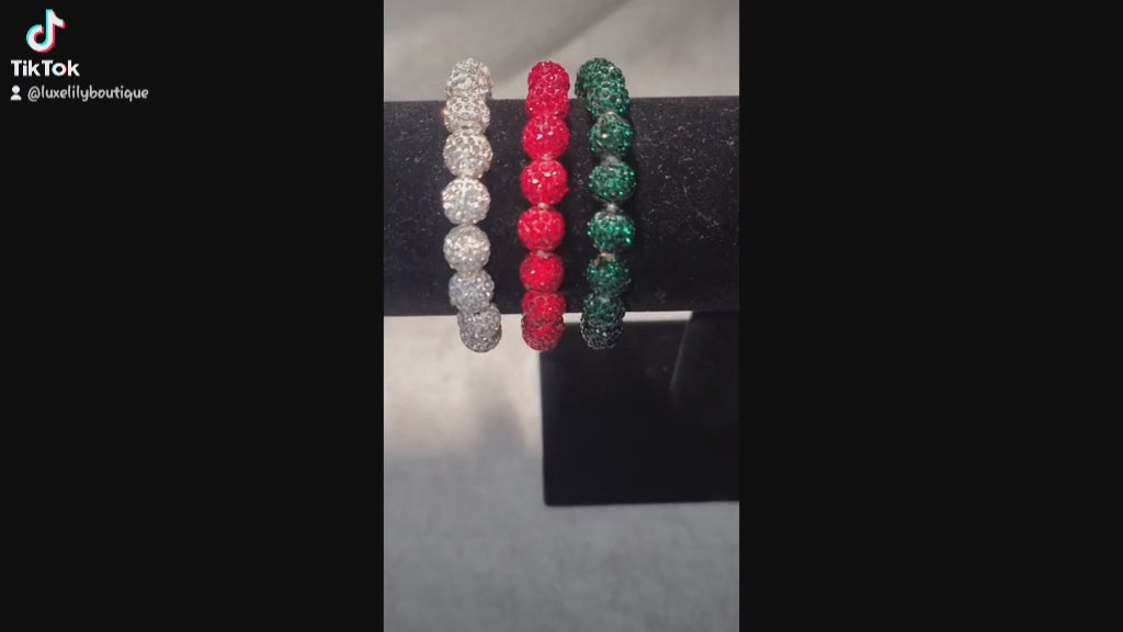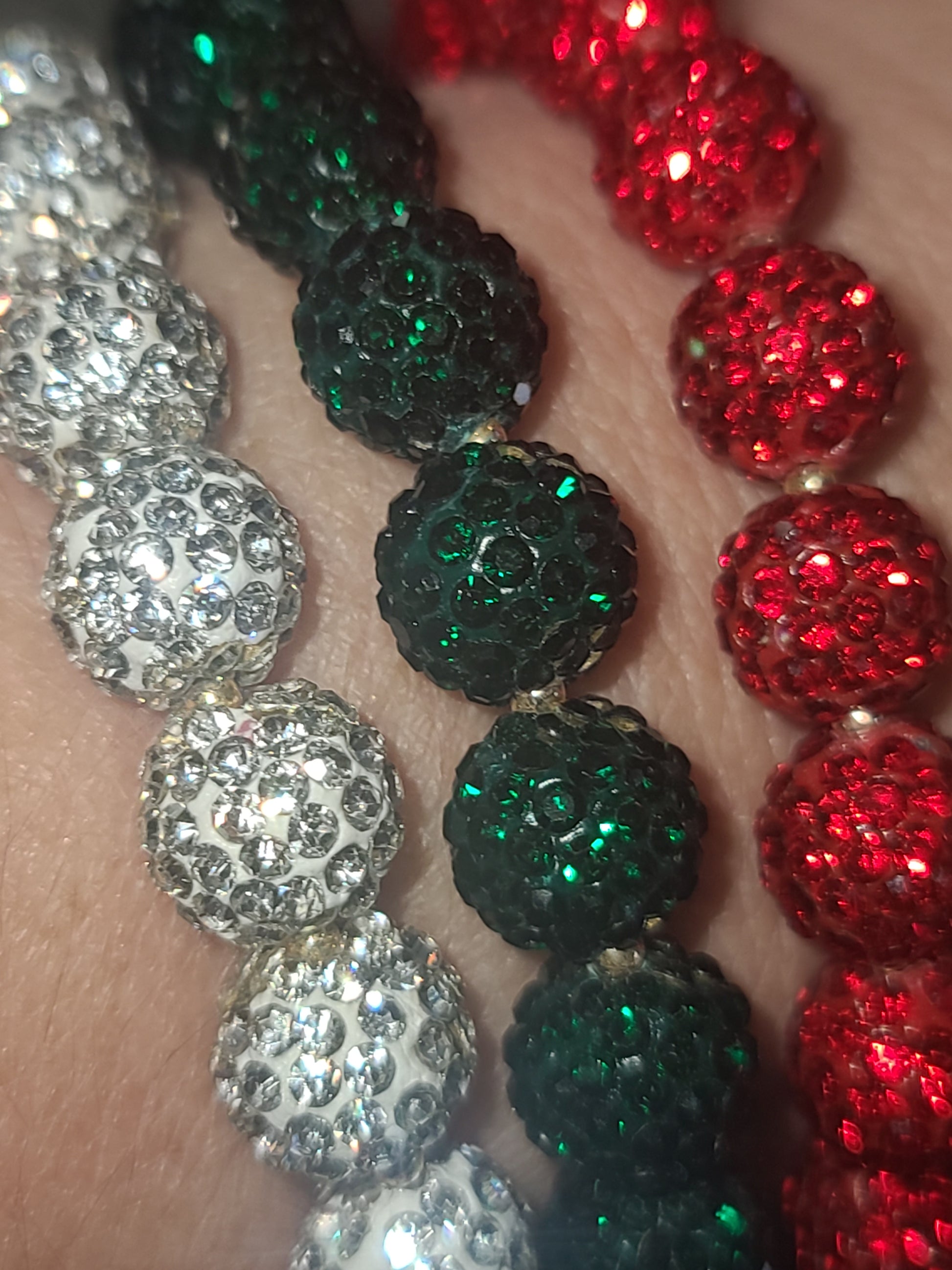 Measuring 2.75 inches when unstretched, these eye-catching bracelets feature vibrant 10 mm beads encrusted with sparkling rhinestones that catch the light beautifully. The festive color palette of rich red, vibrant green, and shimmering silver is perfect for adding a touch of glamour to your holiday attire.