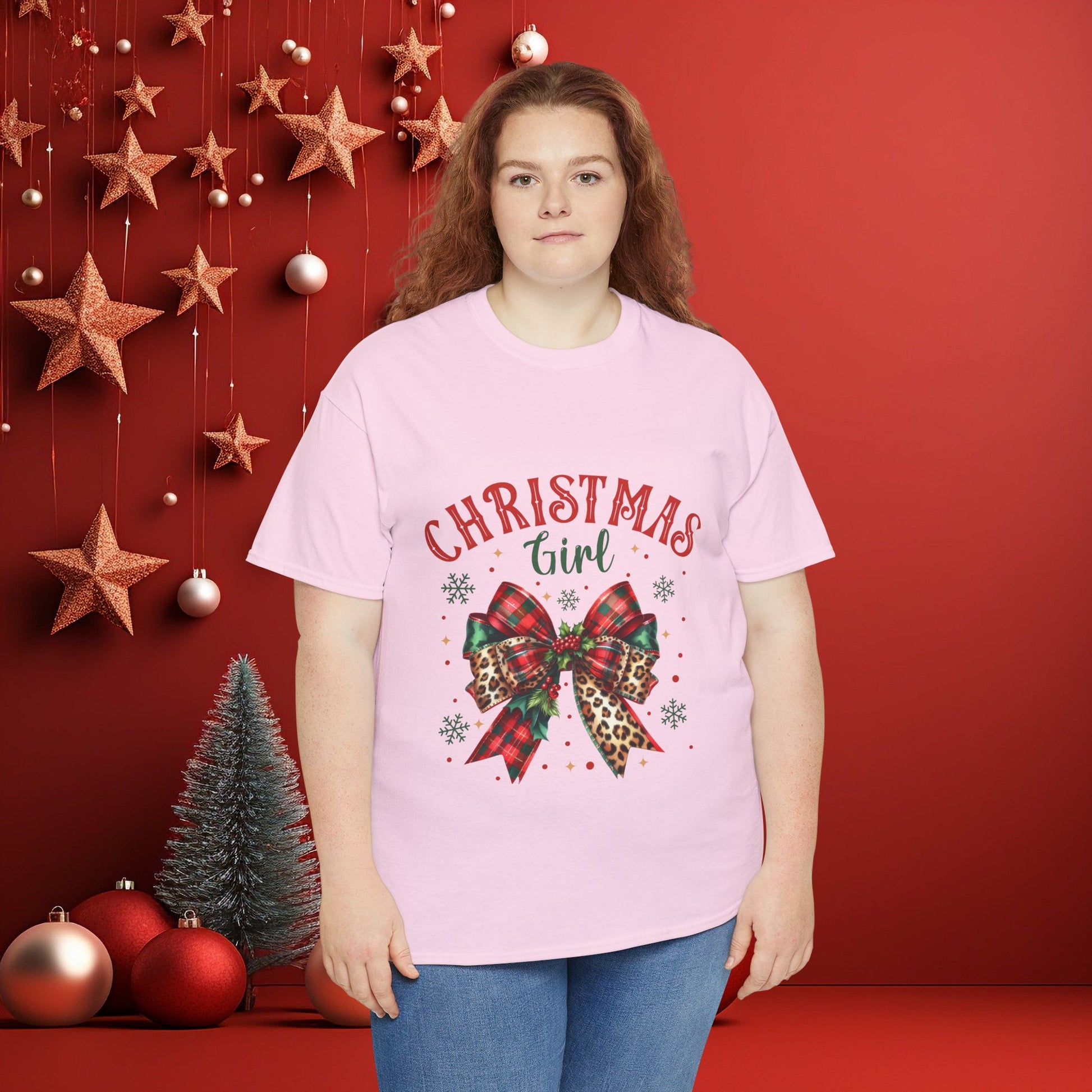 A Christmas girl t-shirt featuring a big decorative bow on the front with short sleeves. This adorable and festive design is perfect for the holiday season and is a great addition to any casual outfit. Ideal for those who love spreading cheer and celebrating Christmas.