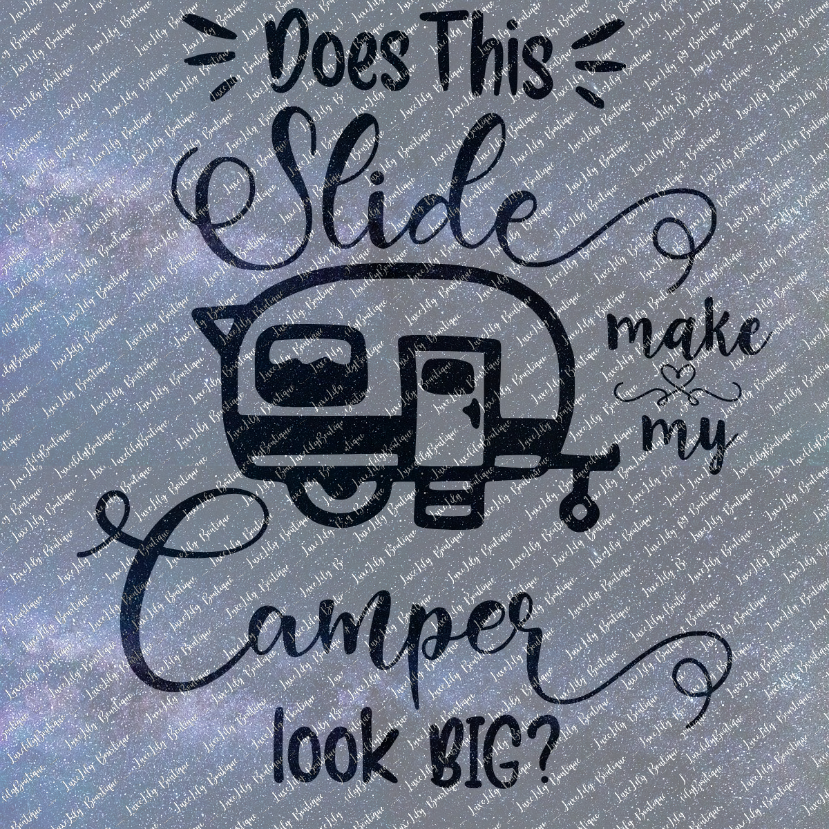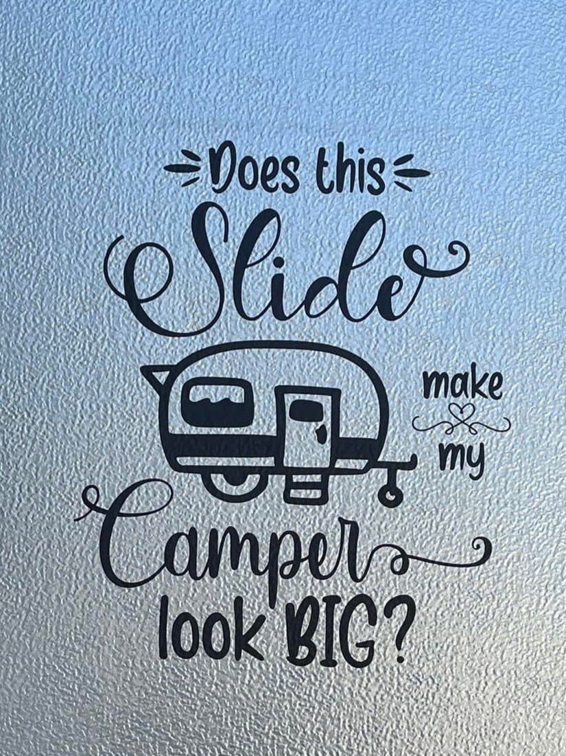Add a touch of humor to your camping adventures with our "Does This Slide Make My Camper Look Big?" vinyl decal! Perfect for any camper looking to share a laugh, this decal is sure to be a hit at the campground.