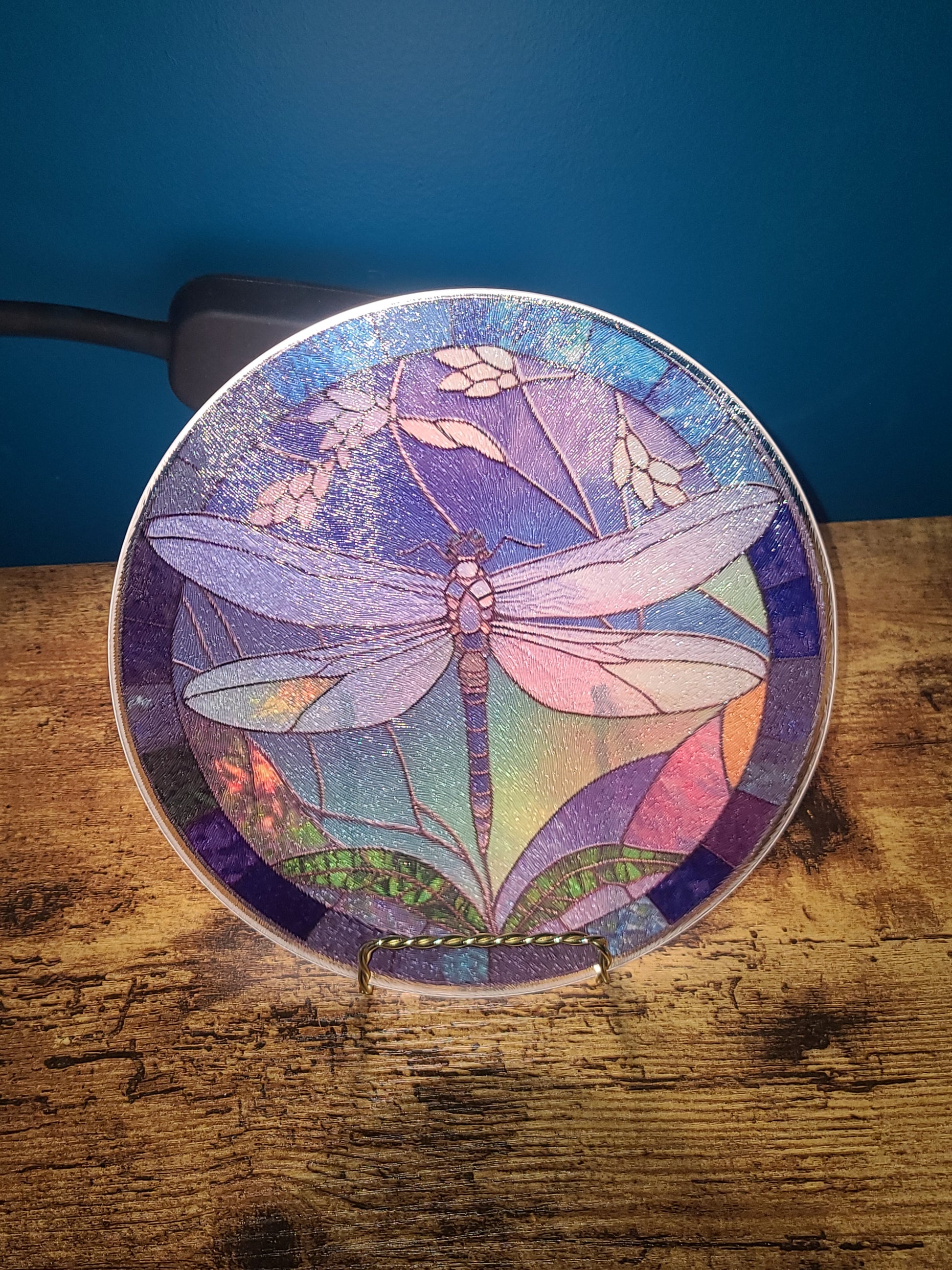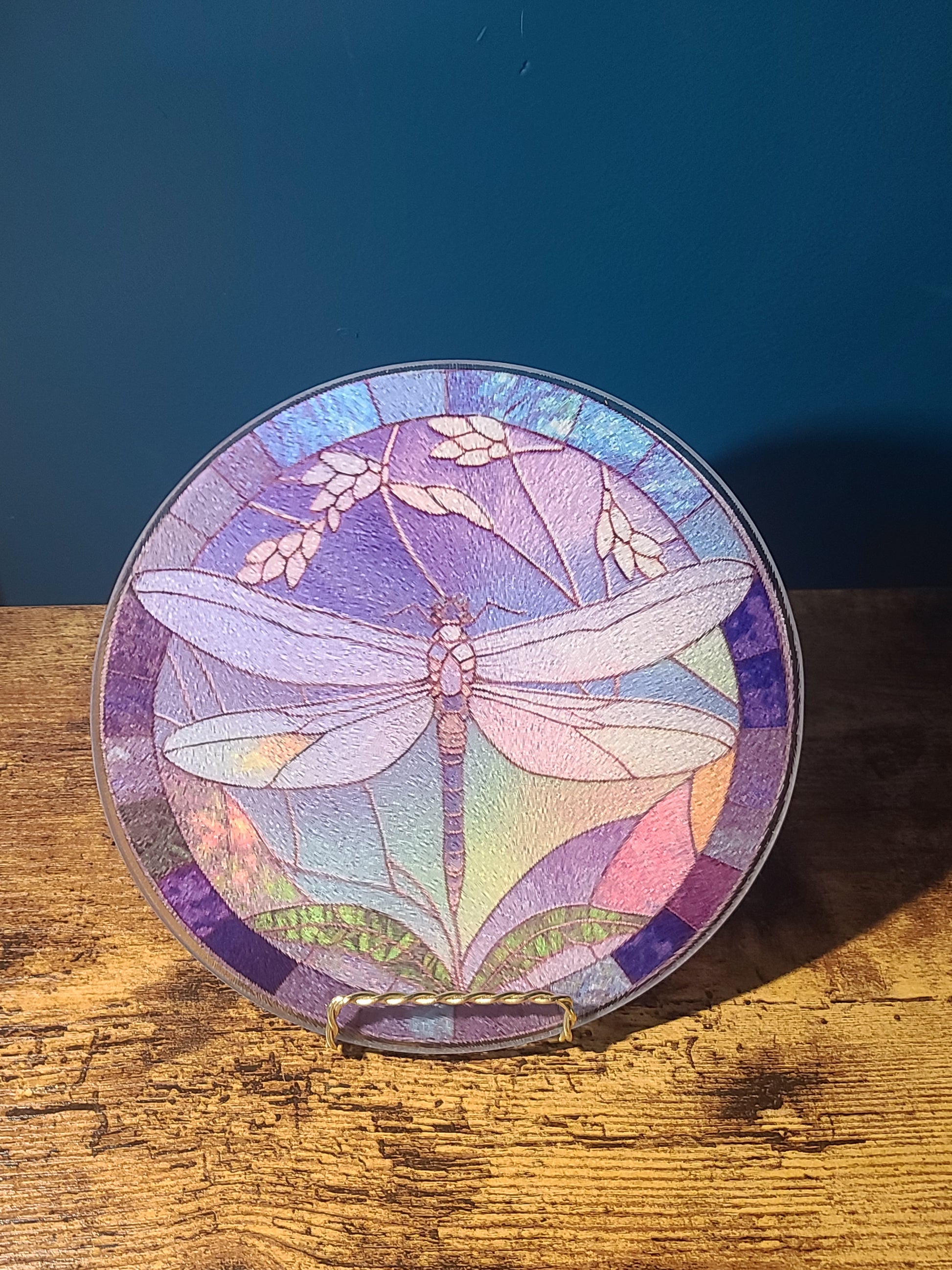 Add a touch of elegance and nature-inspired beauty to your kitchen with this handmade Dragonfly Round Glass Trivet/Cutting Board. Featuring a vibrant, stained glass look, this 7.75-inch round piece showcases a delicate dragonfly design, bringing a sense of tranquility and charm to your home.