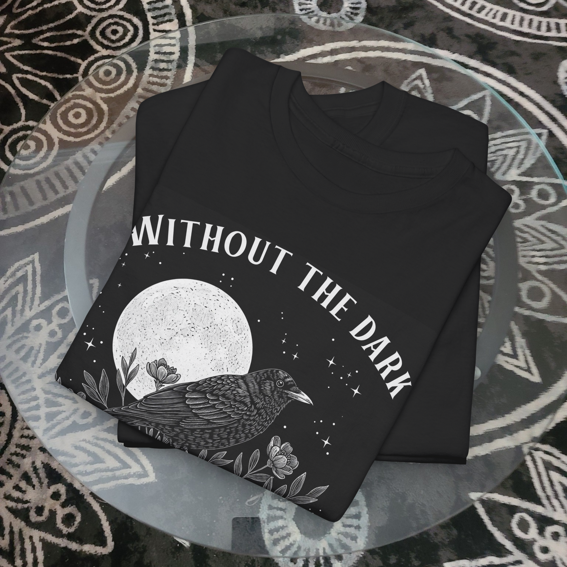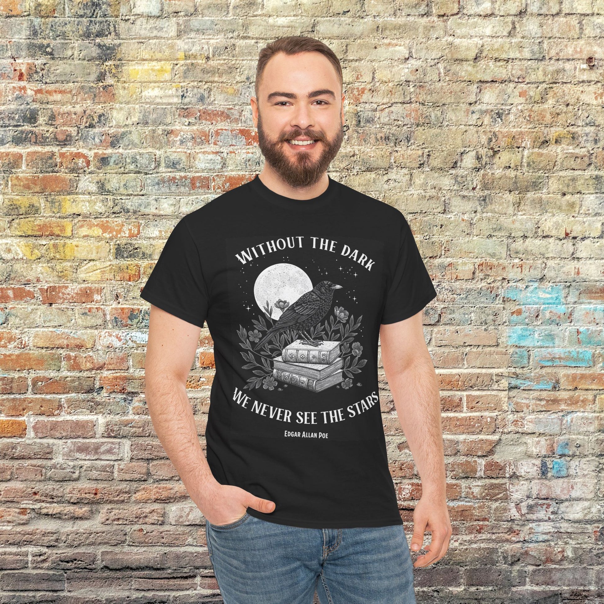 Embrace the mystery with this Edgar Allan Poe-inspired unisex tee. Featuring the hauntingly beautiful quote "Without the dark, we never see the stars," this shirt is perfect for lovers of gothic literature, starry nights, and thought-provoking fashion.