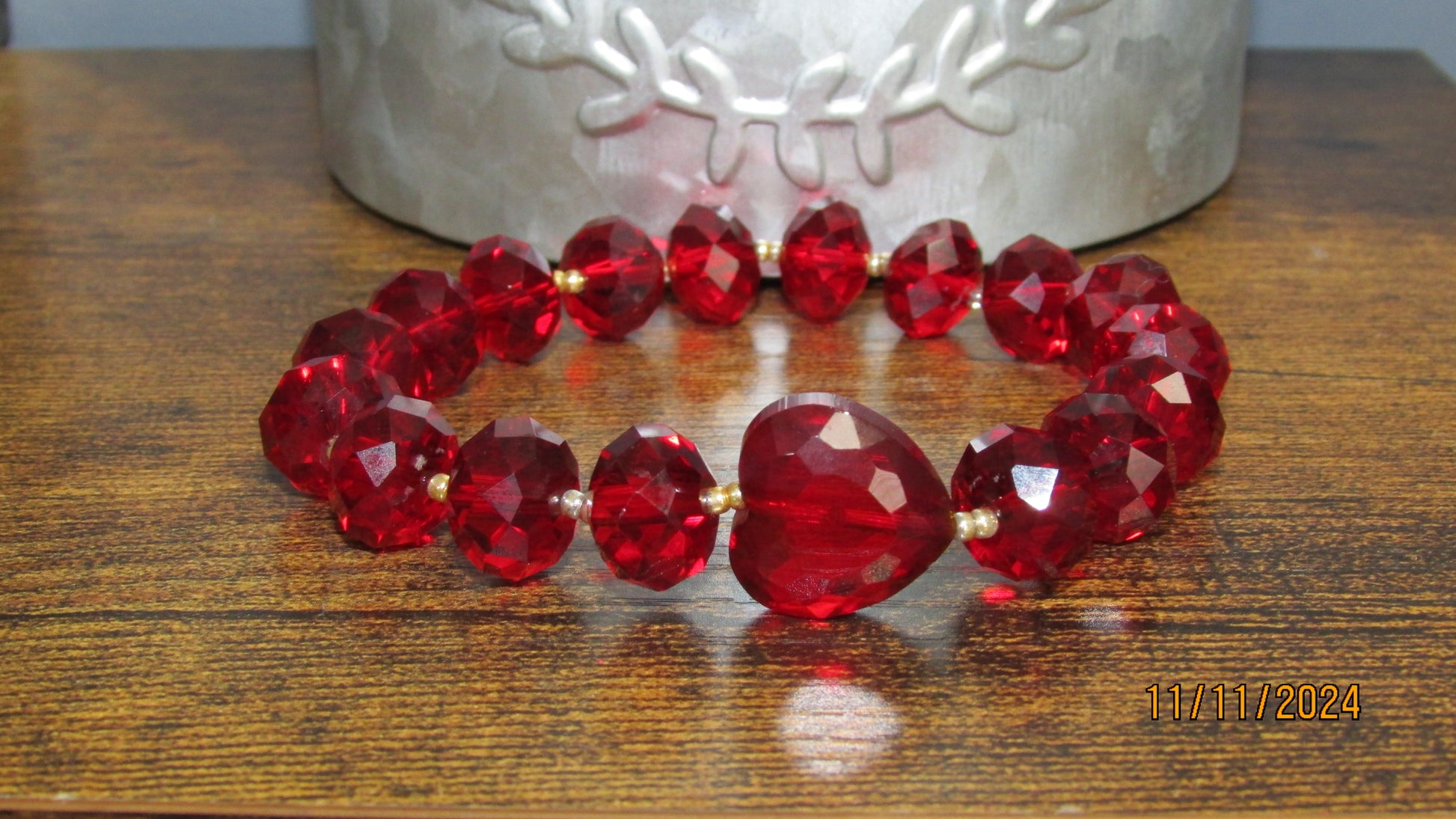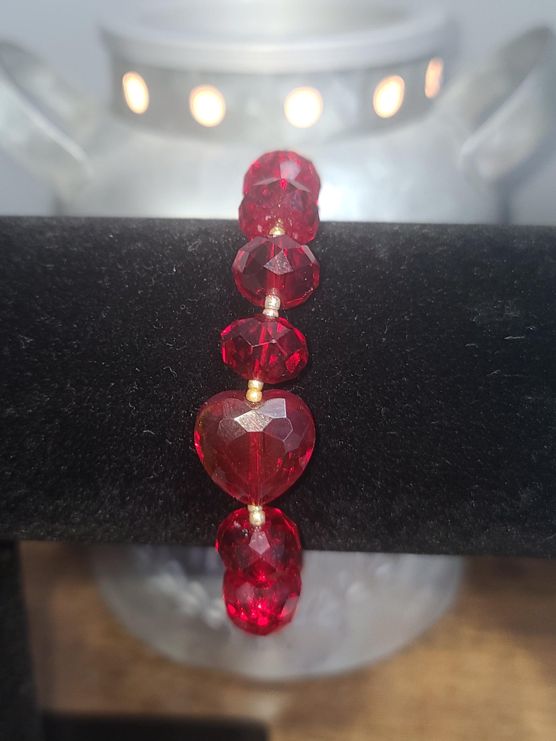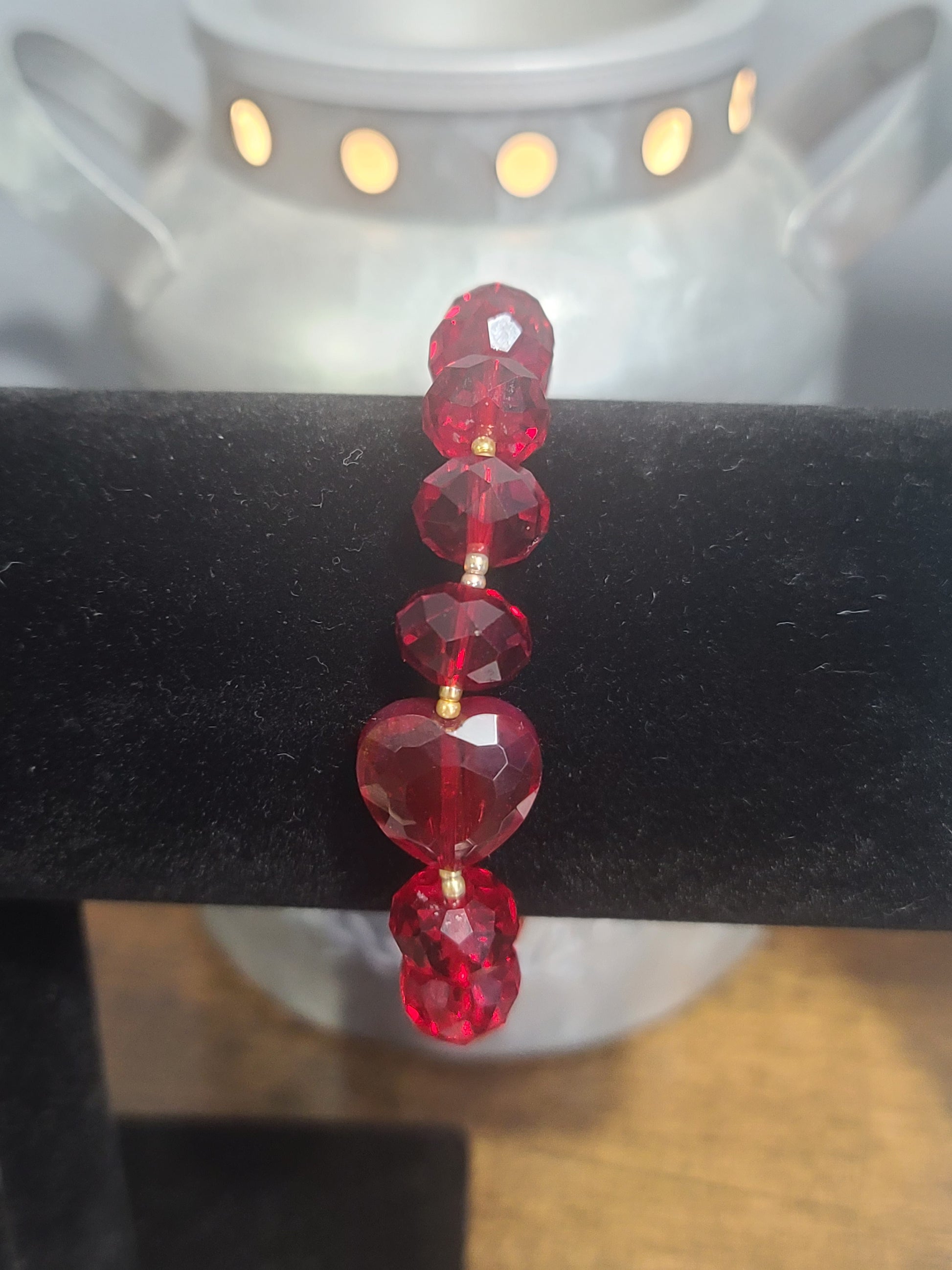 Handmade Red Faceted Glass Beaded Stretch Bracelet with Heart and Gold Beads