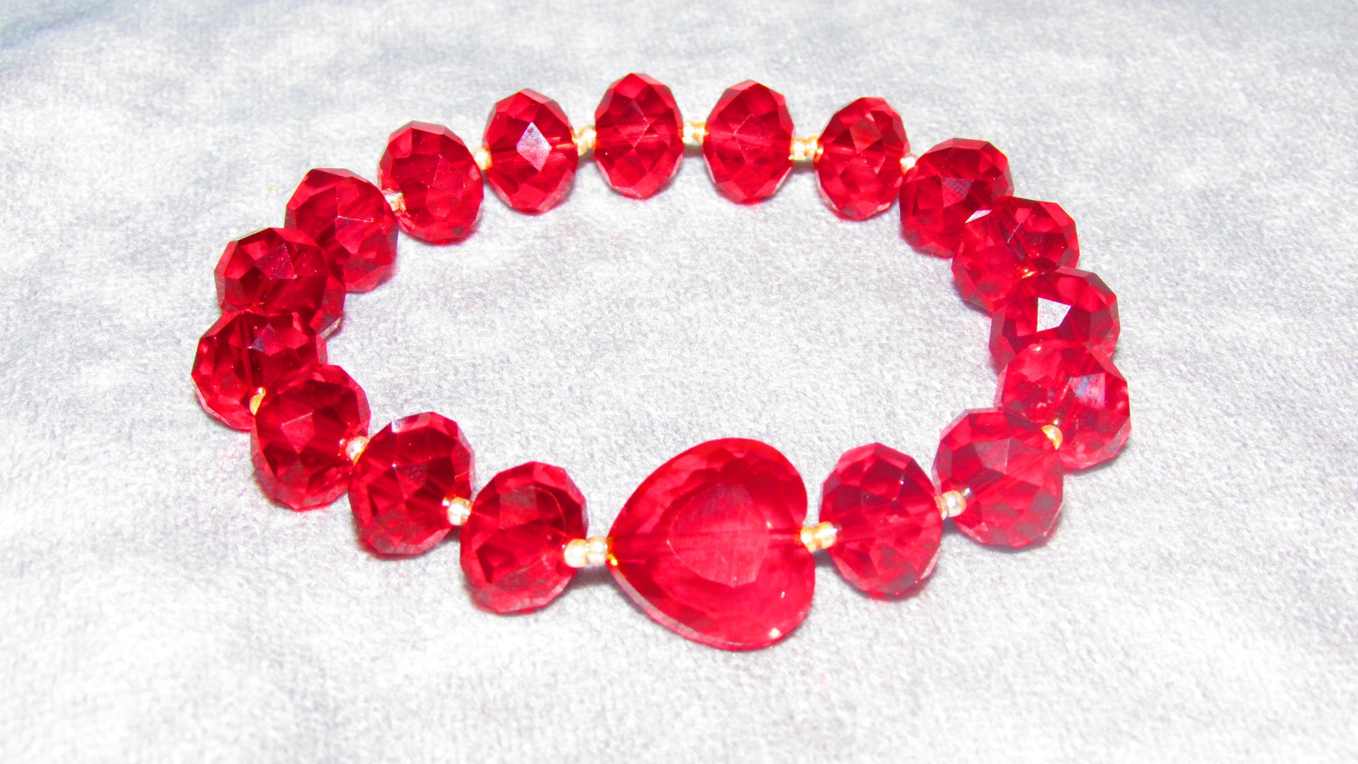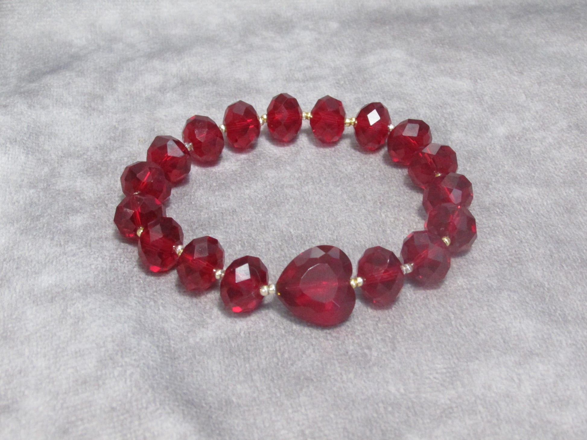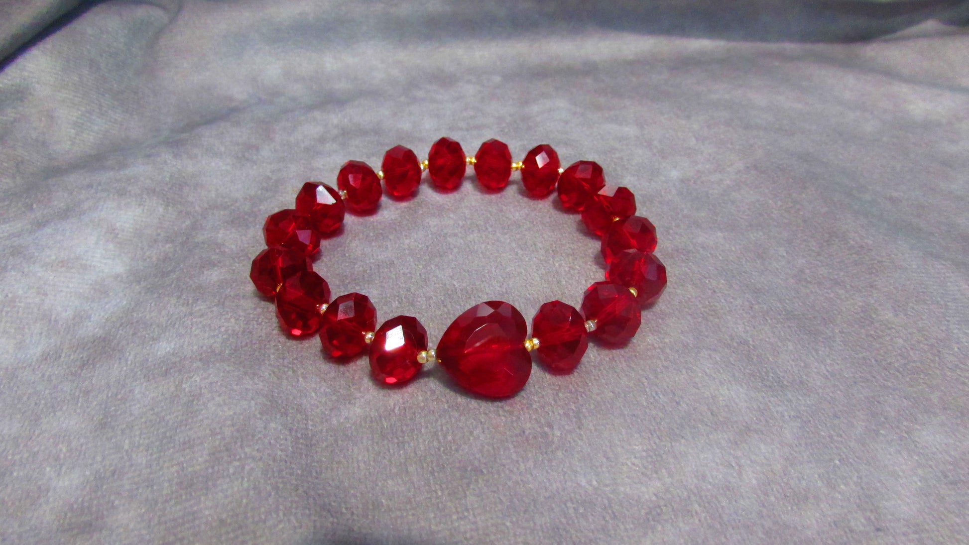 Handmade Red Faceted Glass Beaded Stretch Bracelet with Heart and Gold Beads