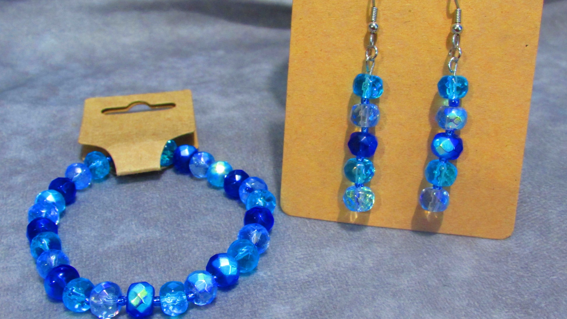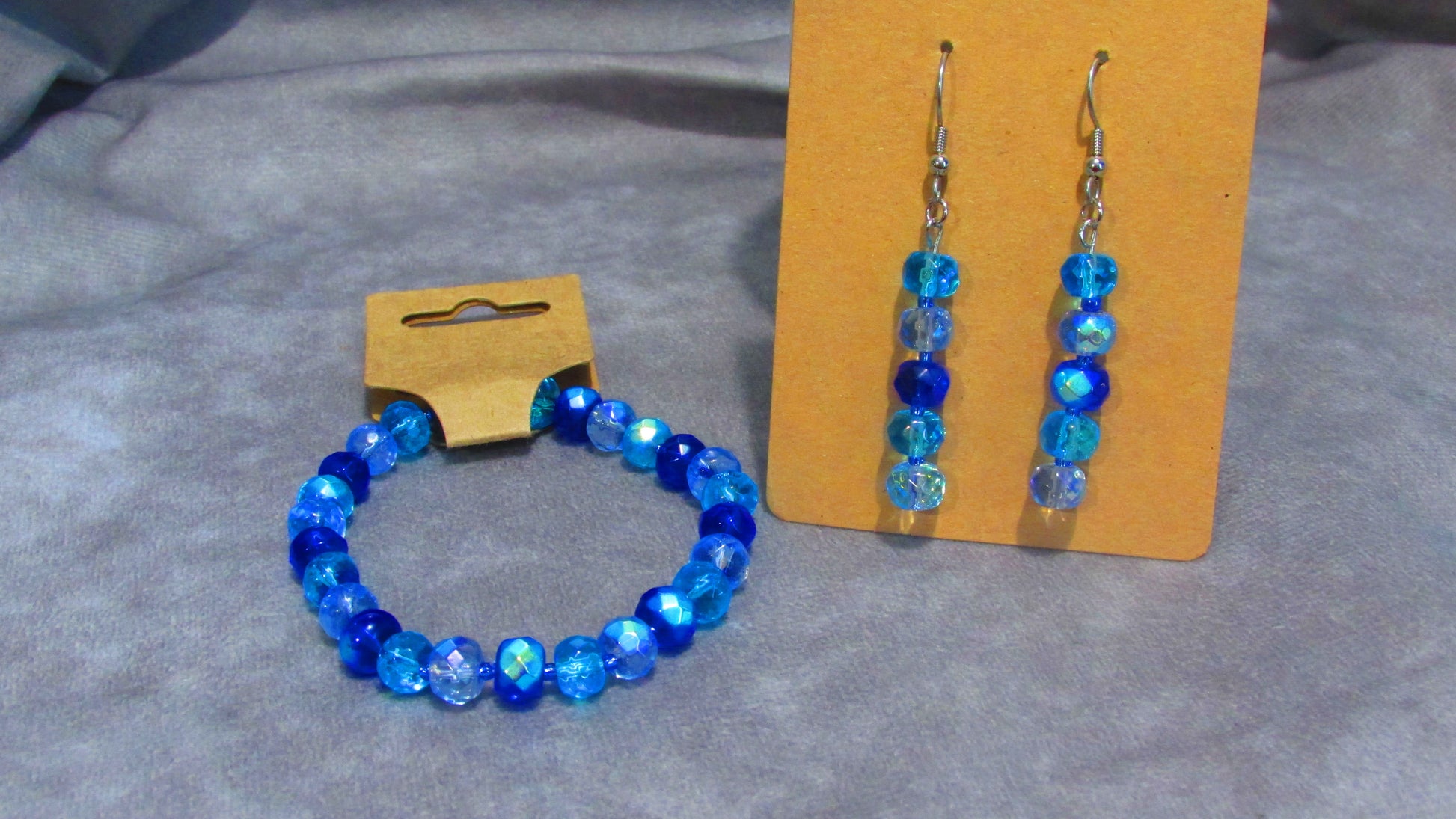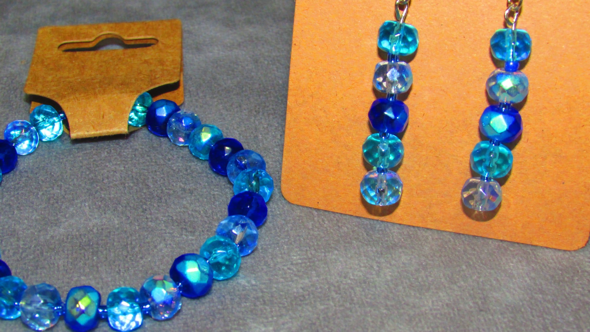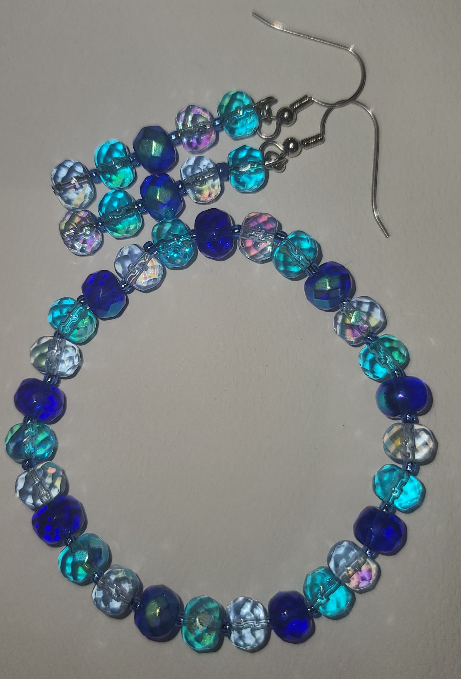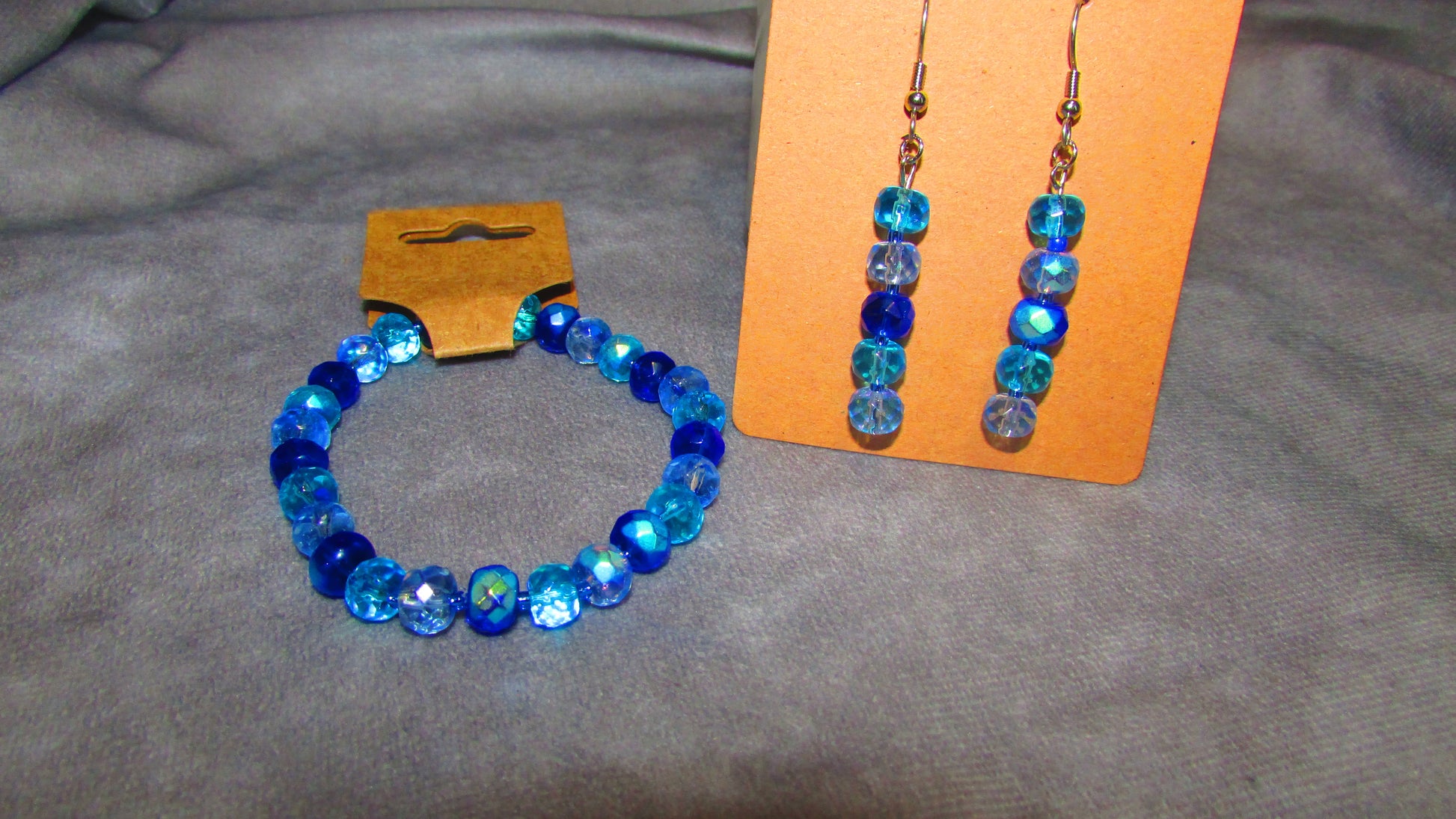 Handmade Stretch Multi-colored Blue Iridescent Glass Beaded Bracelet and Earring Set