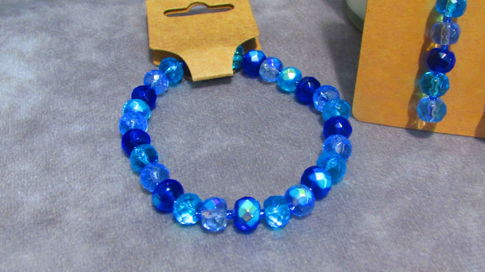 This handmade stretch beaded bracelet is a vibrant and eye-catching piece, crafted with love using multi-colored blue faceted glass beads that glimmer and shine with every movement. The bracelet, measuring 8" in diameter, is designed to comfortably fit most wrist sizes, offering a chic and stretchy design perfect for everyday wear.