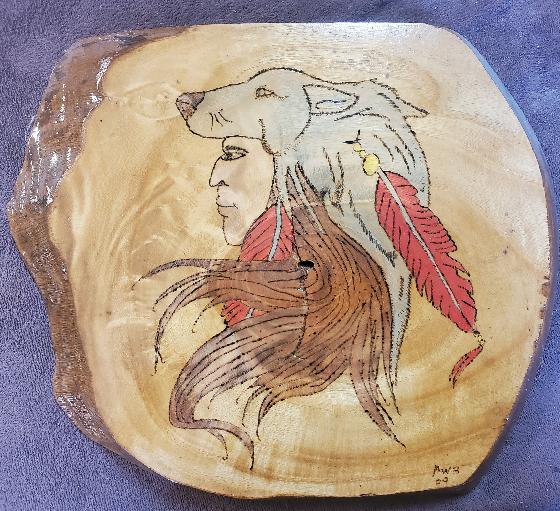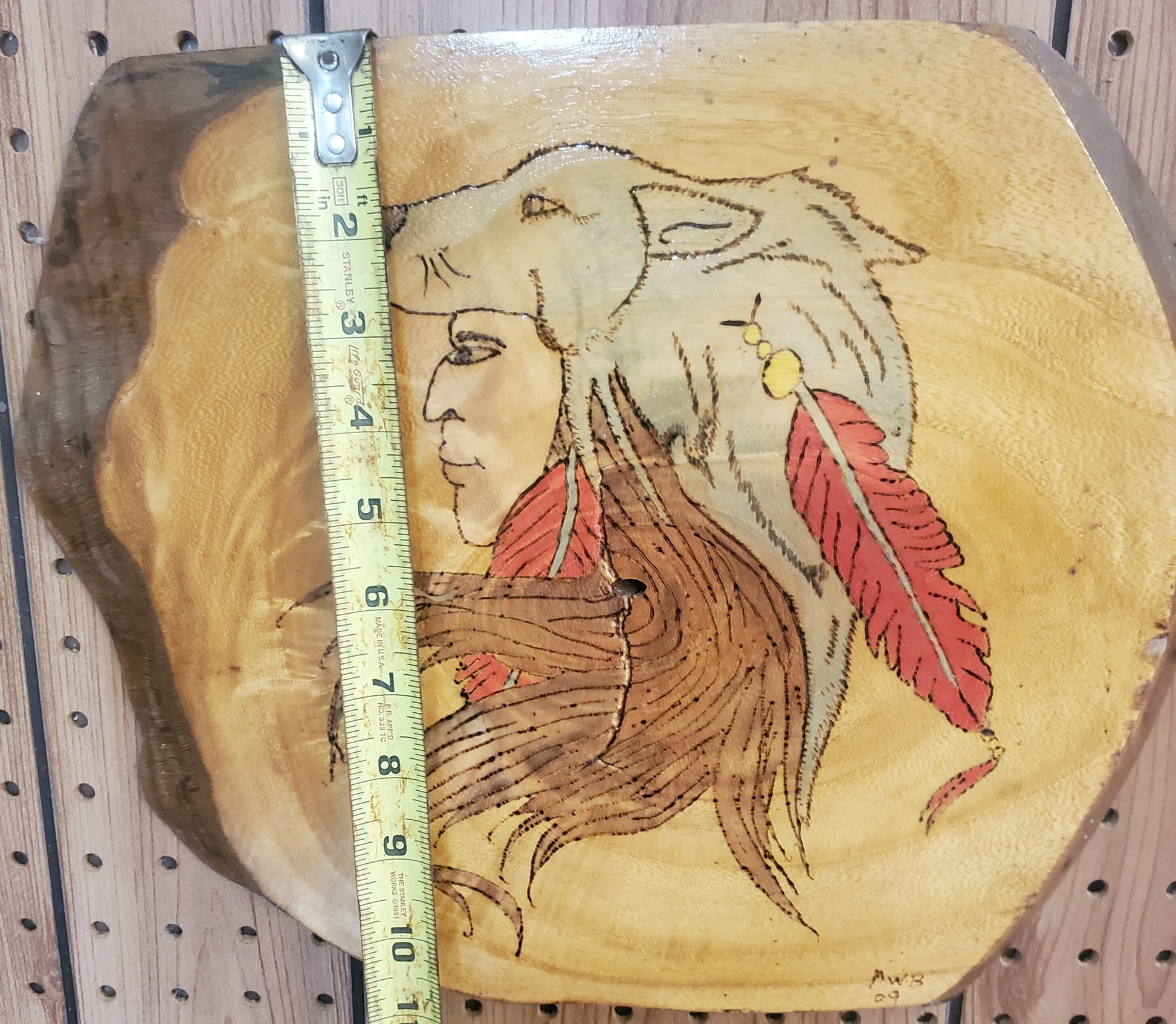 This is a handmade wall plaque, burned and painted all by hand. This piece was created in 2009 by my Dad. This is a one of a kind piece. No piece of wall art is the same. It is made out of Paulownia wood (Empress tree) from a tree that was cut down on our property. The plaque weighs 1.6 pounds due to Paulownia wood being so light of a wood. It measures 12.5" at is widest point and 11" at the longest. There are wormholes that are detailed in the wood. Sealed with polyurethane. Please contact me with any questions.