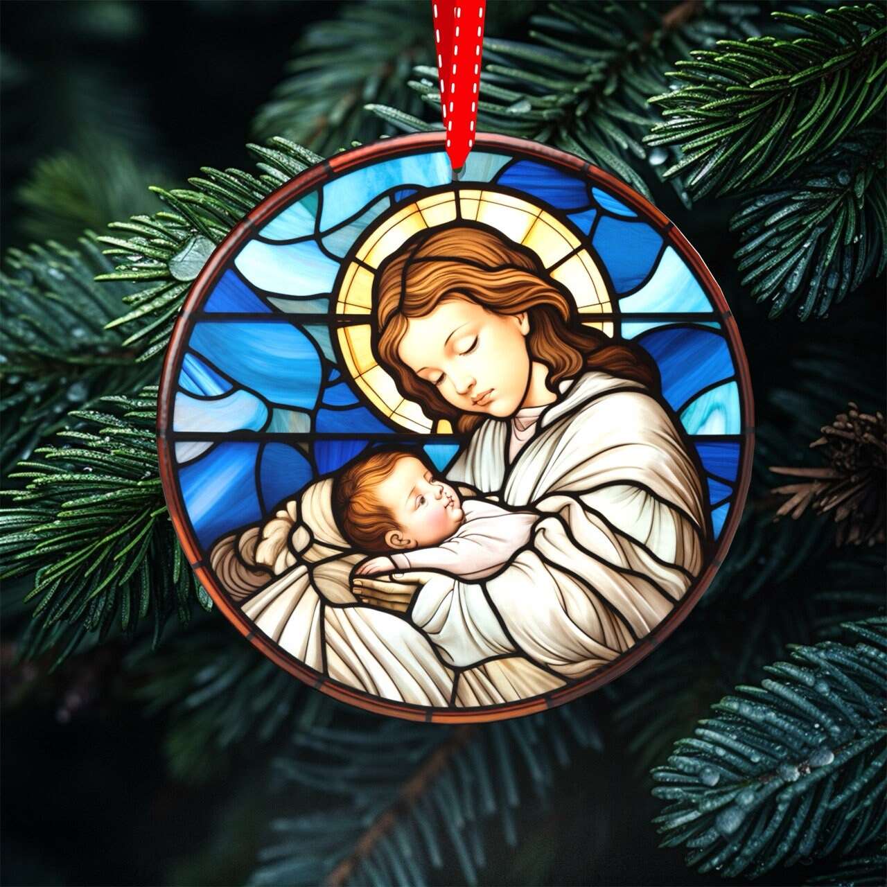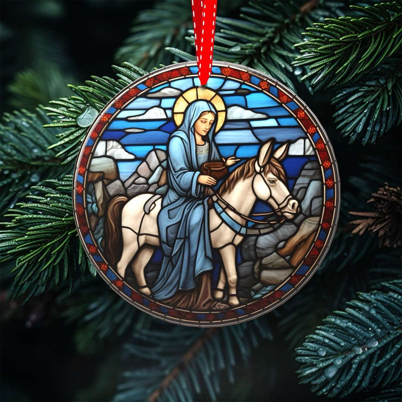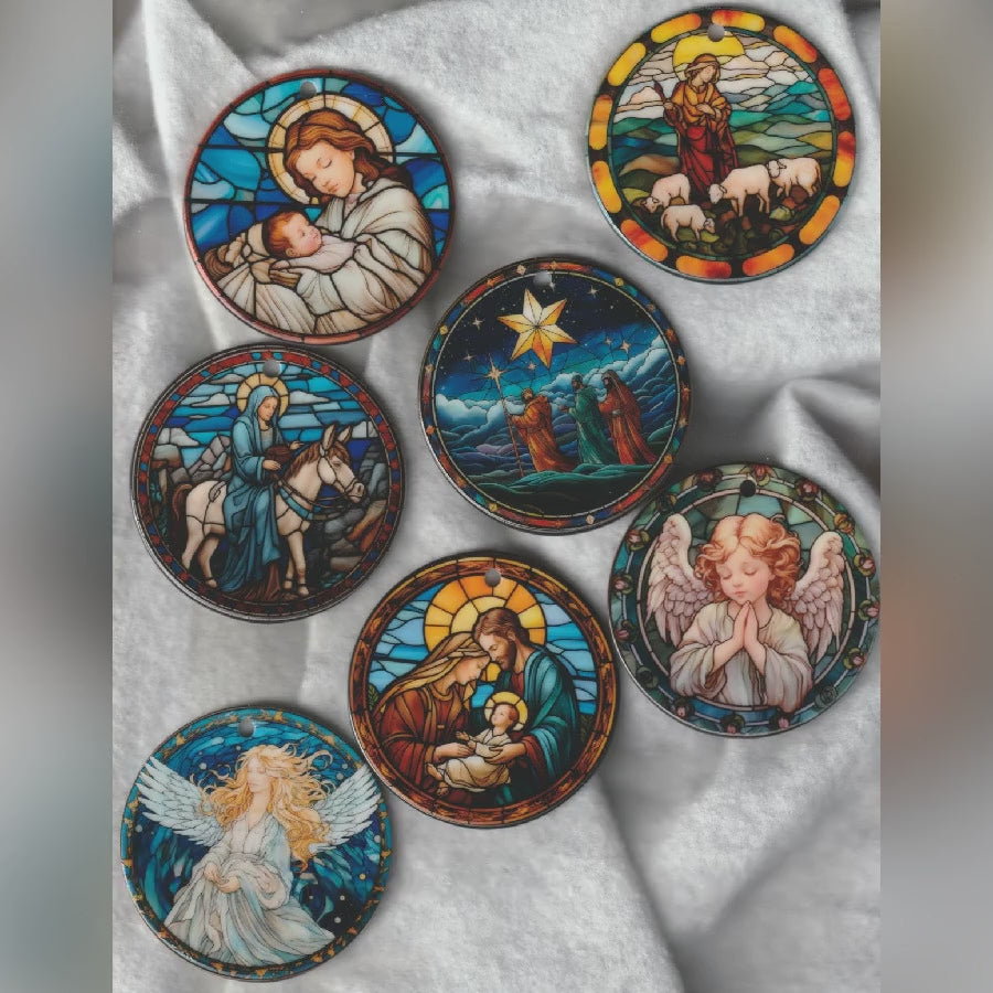 Heavenly Glow - Set of 7 Stained Glass Nativity Scene Ornaments, UV Printed Porcelain