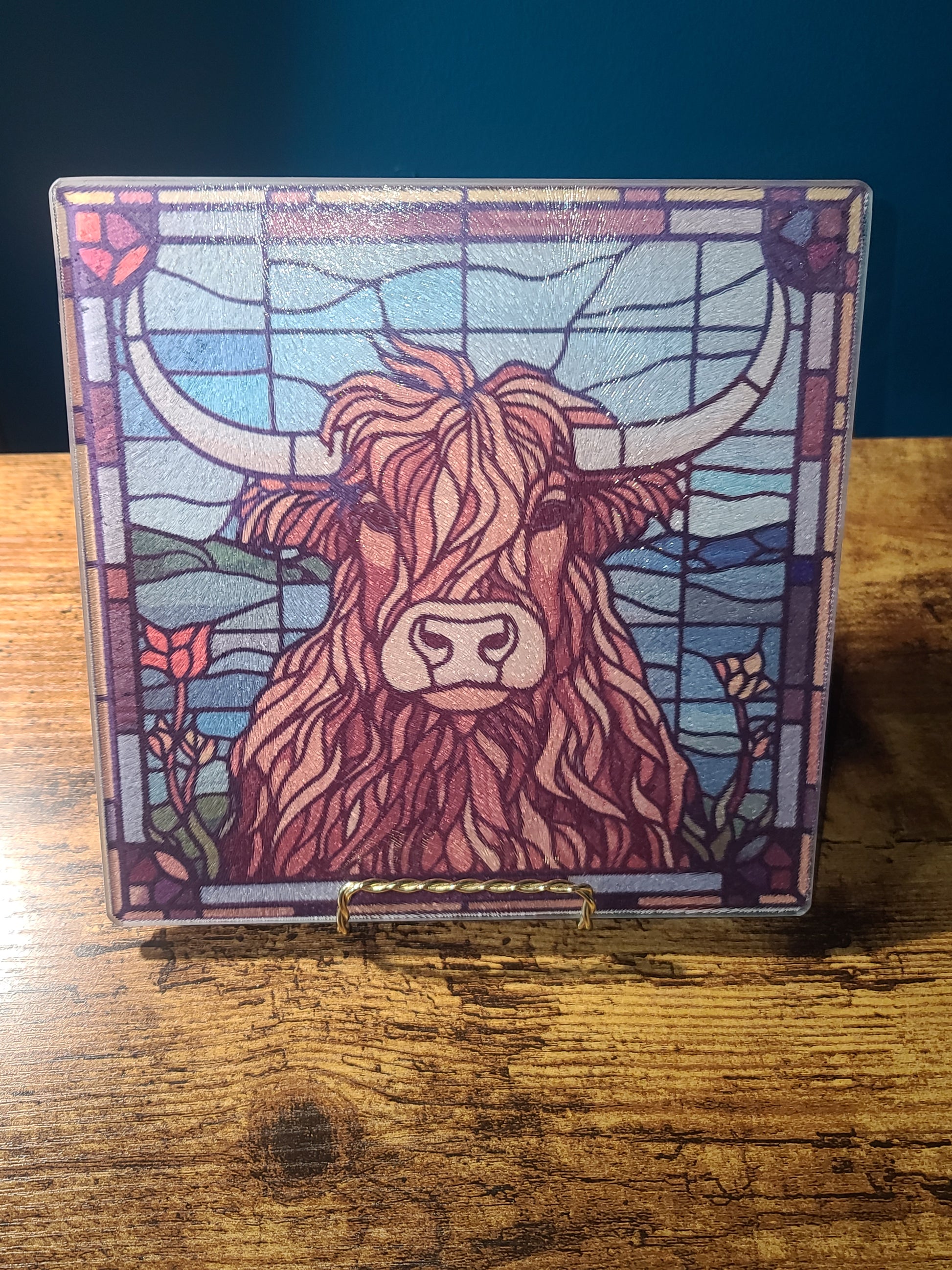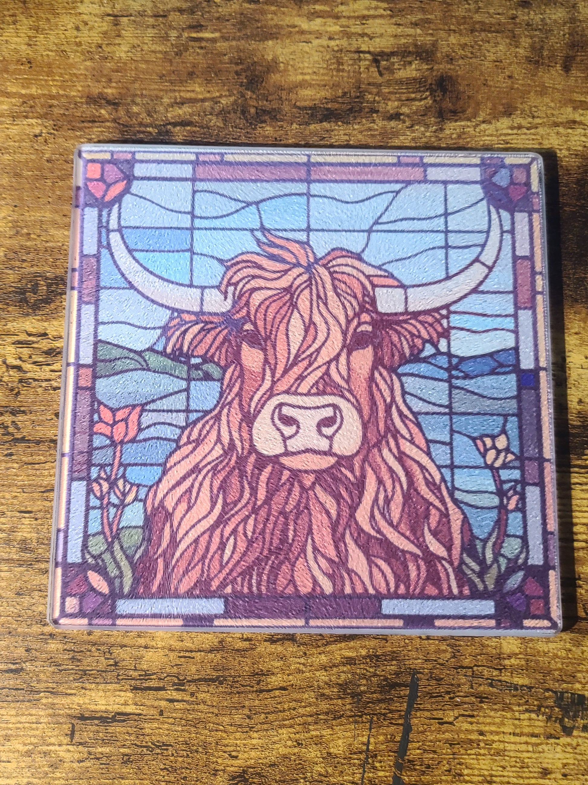 Add a touch of rustic charm and artistic beauty to your kitchen with this handmade Highland Cow Square Glass Trivet/Cutting Board. Featuring a stunning stained glass look, this piece measures 7.75 x 7.75 inches and showcases a beloved Highland cow design, perfect for those who appreciate both nature and unique decor.