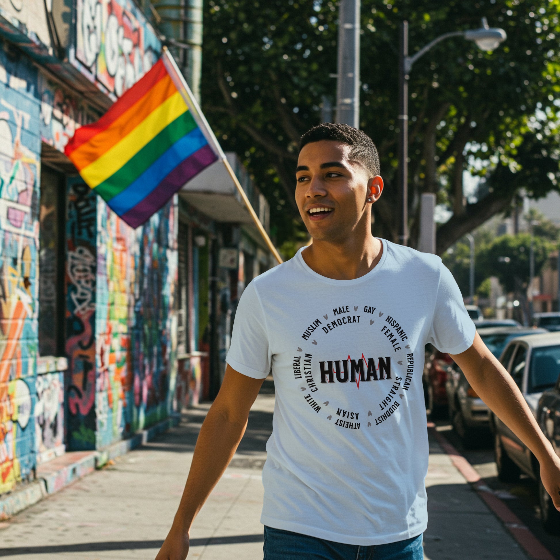 We designed this t-shirt to speak directly to the heart. The bold, central "HUMAN" text sits on a vibrant heartbeat graphic, symbolizing that life and our common pulse are what connect us. Surrounding the word in a unifying circle are labels we often use to define ourselves—liberal, conservative, Christian, Muslim, male, female, and more. Each is separated by a simple heart, reinforcing that empathy and kindness are the threads that bind us together.