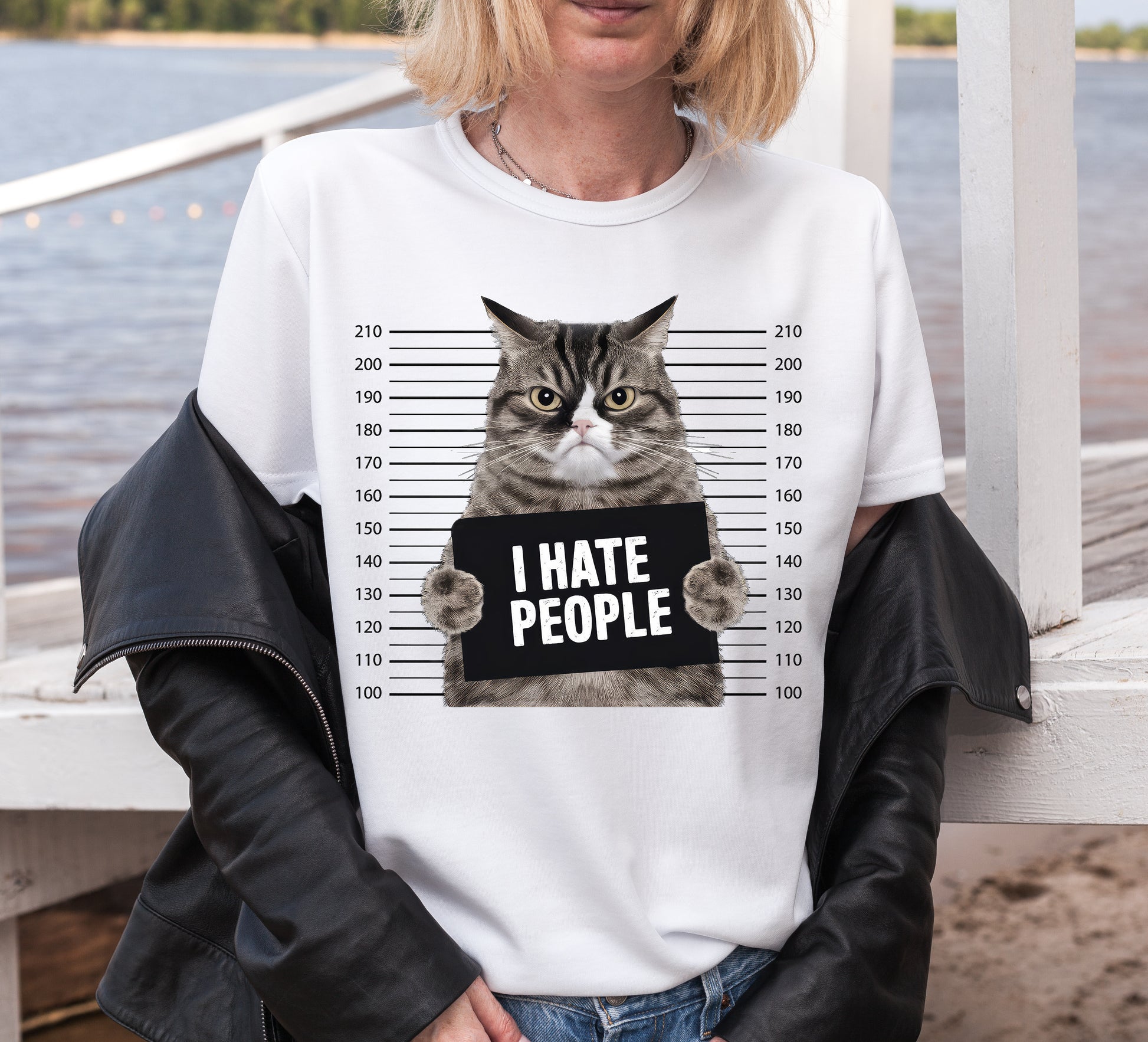 Let the world know how you feel—add this funny "I Hate People" cat t-shirt to your wardrobe and wear your mood proudly!