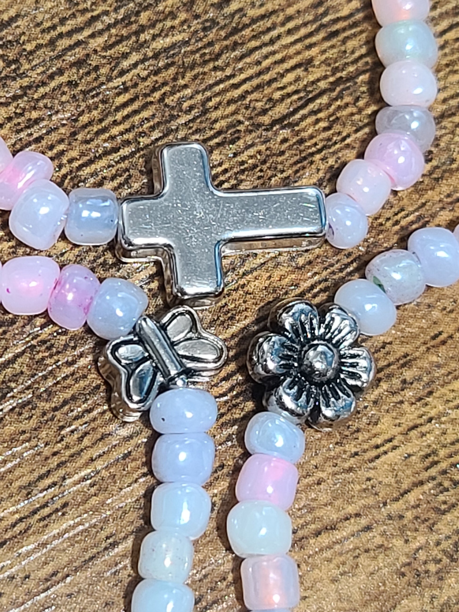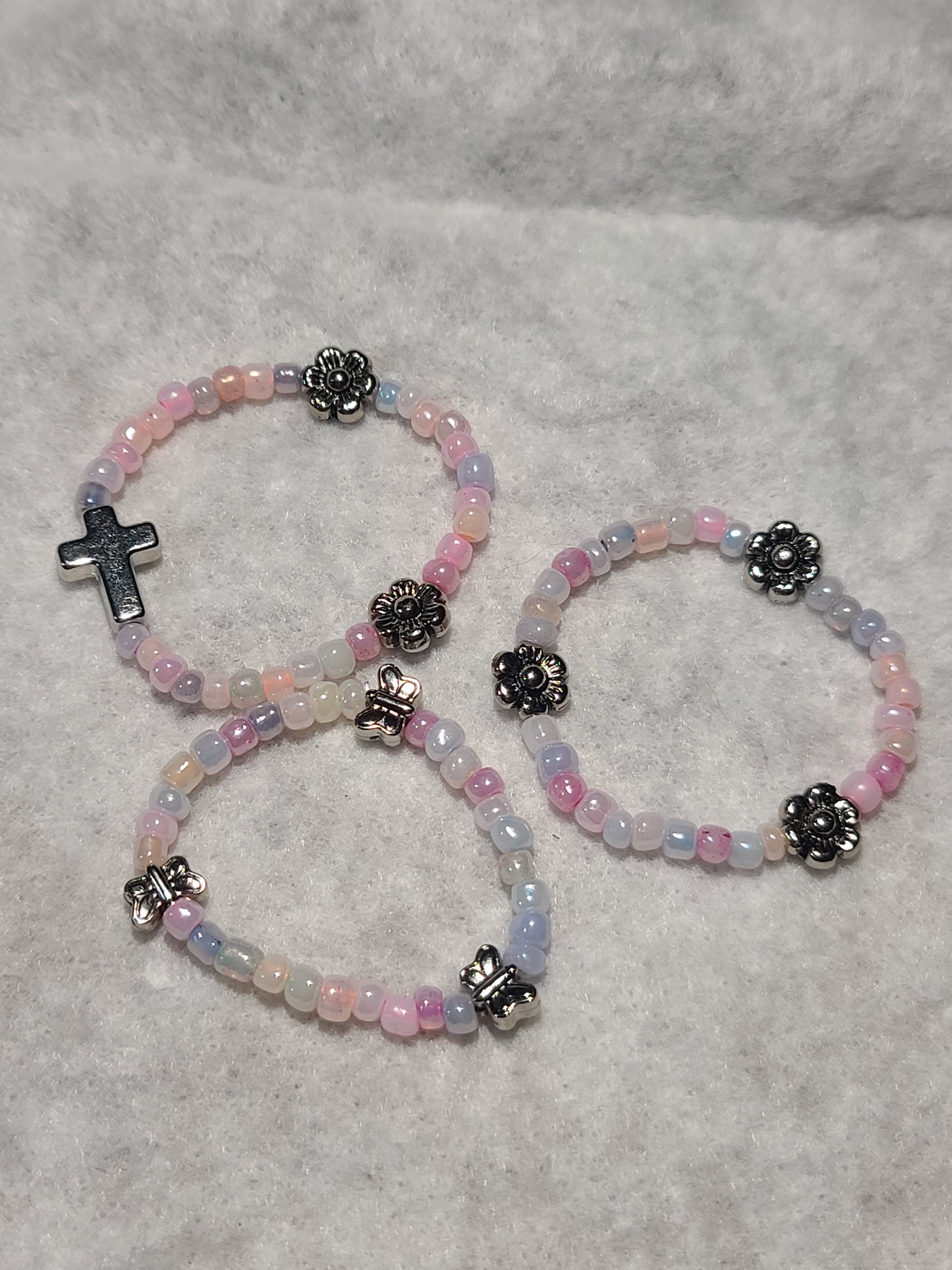 Little Girl's Three-Strand Handmade Stretch Beaded Bracelet Set with Cross, Flowers and Butterflies