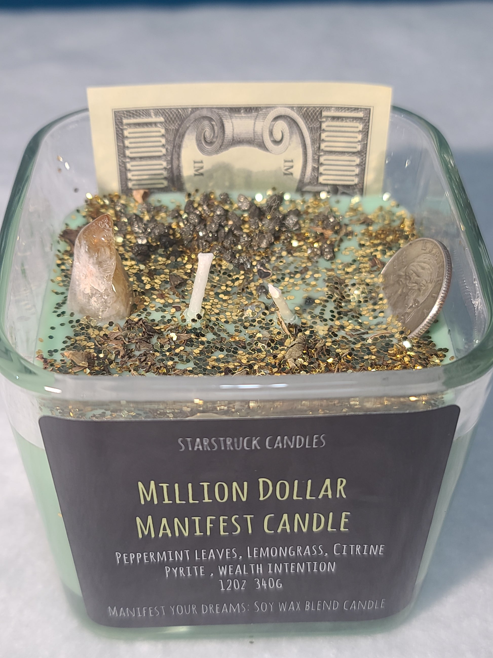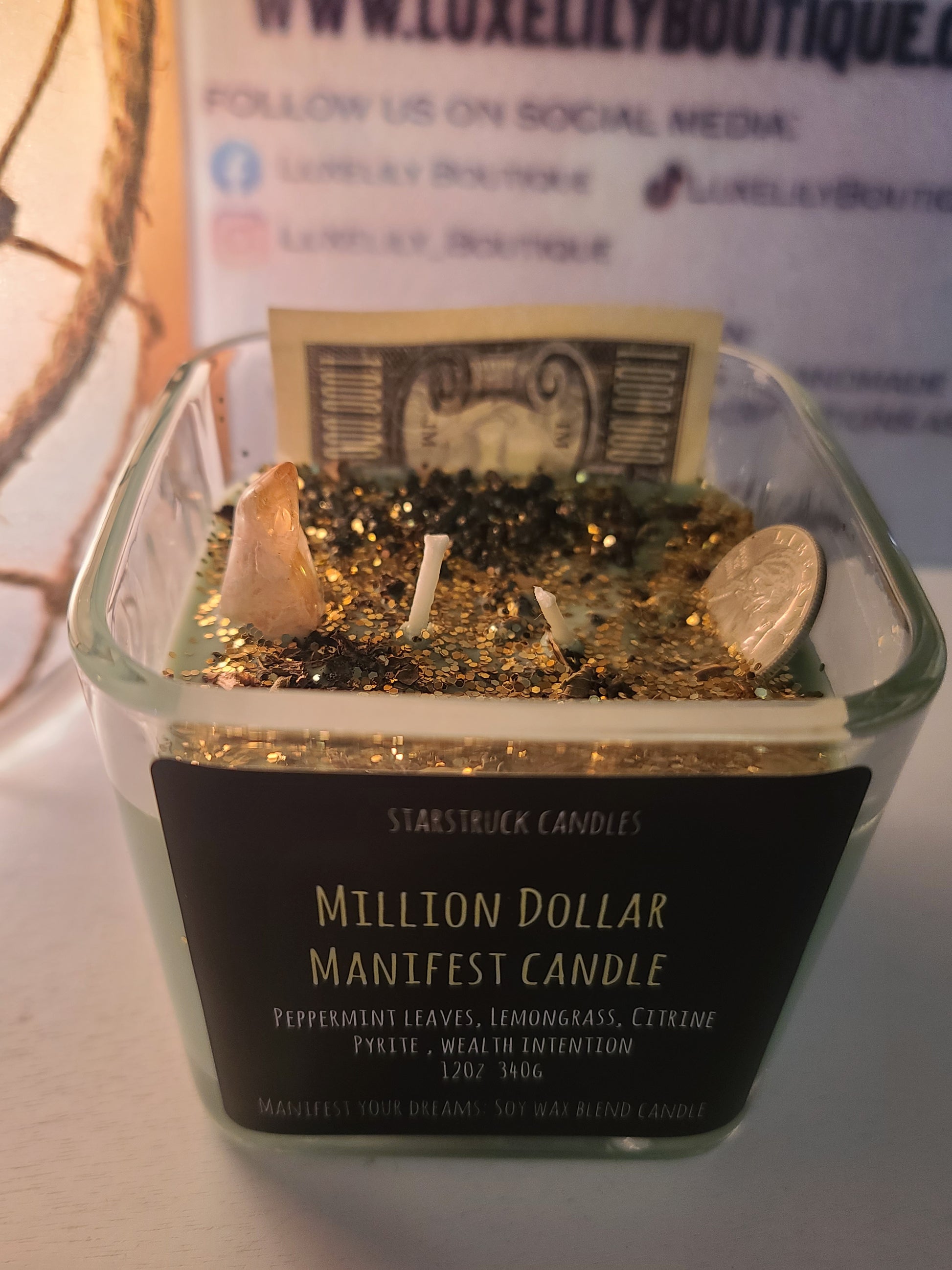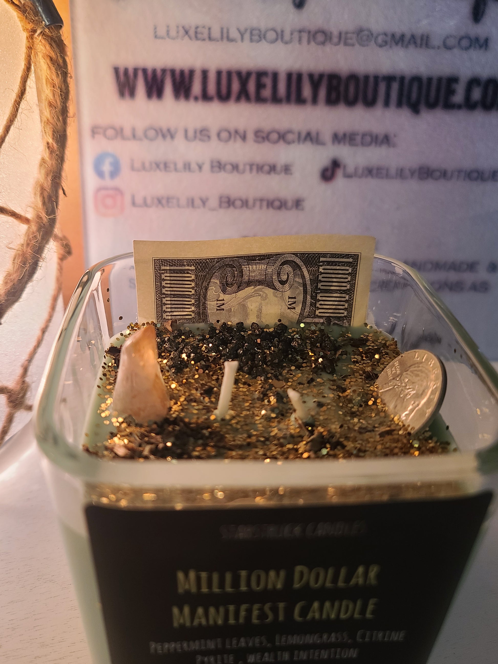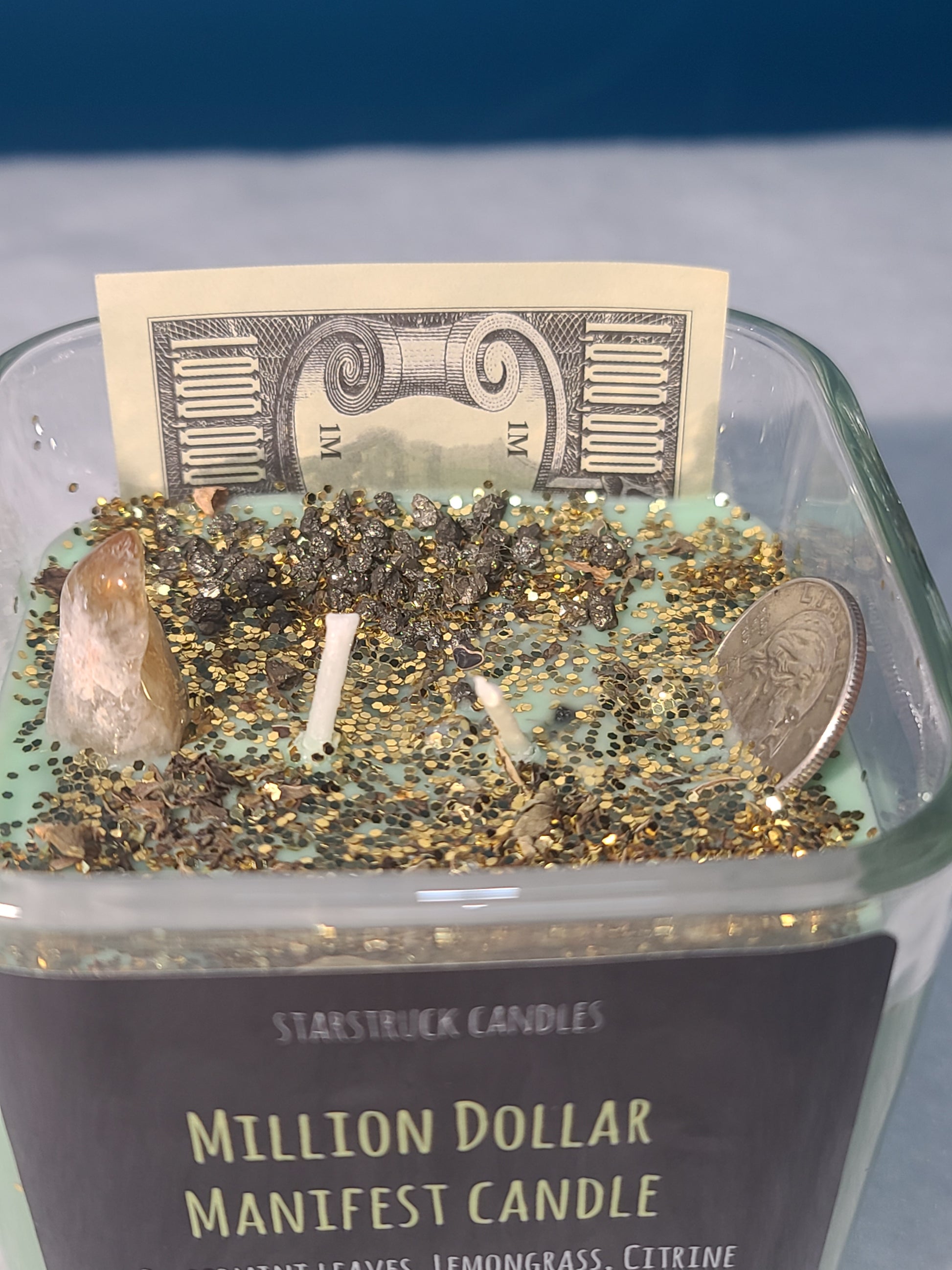 Manifest financial success, prosperity, and positive energy with the Million Dollar Crystal Manifest Money Intention Soy Candle, infused with citrine crystals and lemongrass essential oil. This hand-poured soy wax candle is designed to help you attract wealth, amplify abundance intentions, and align with financial growth. Whether you’re setting money affirmations, meditating on success, or practicing the Law of Attraction, this candle enhances your manifestation journey.