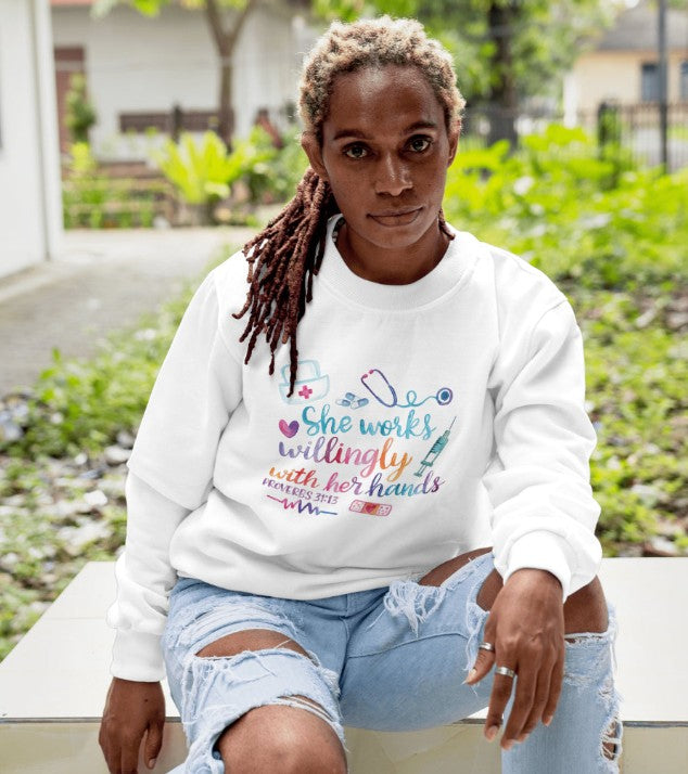 She Works Willingly with Her Hands (Proverbs 31:13) Sweatshirt for Nurses and Medical Personnel