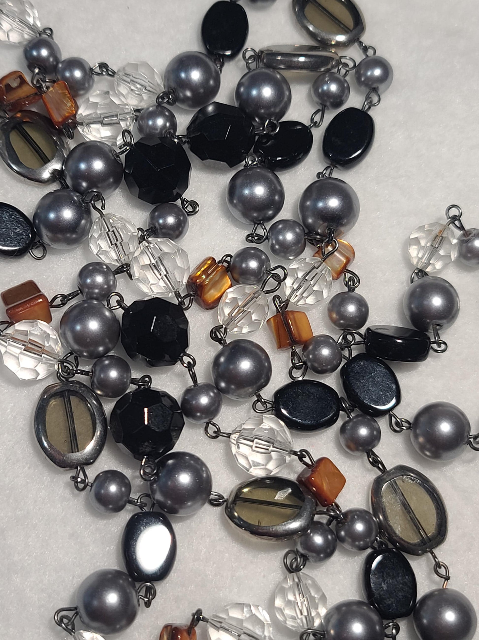 - Materials: Crafted with a delightful mix of faux pearls, shells, glass, tiger eye, and beads, all elegantly showcased on a black nickel-plated chain.