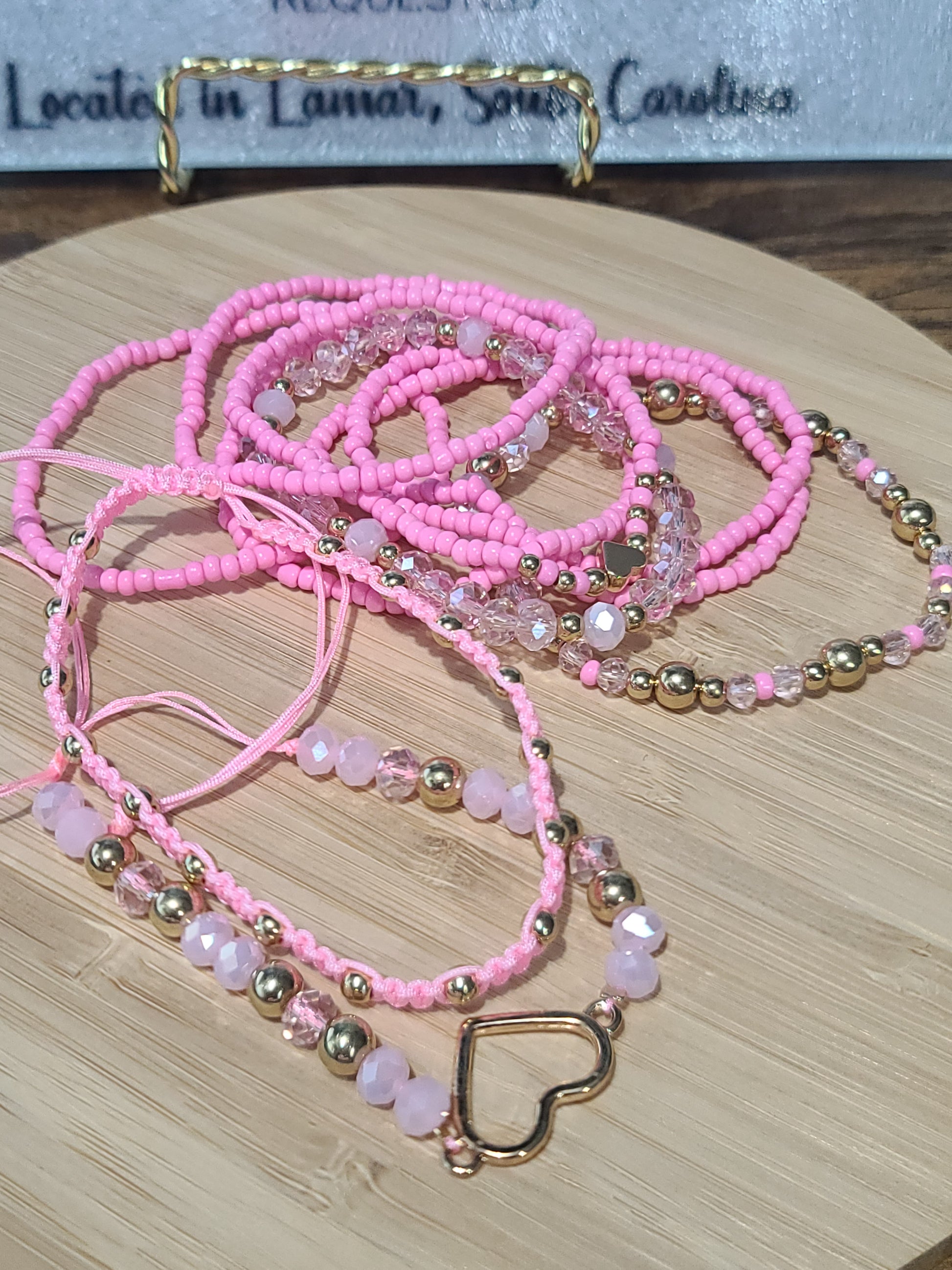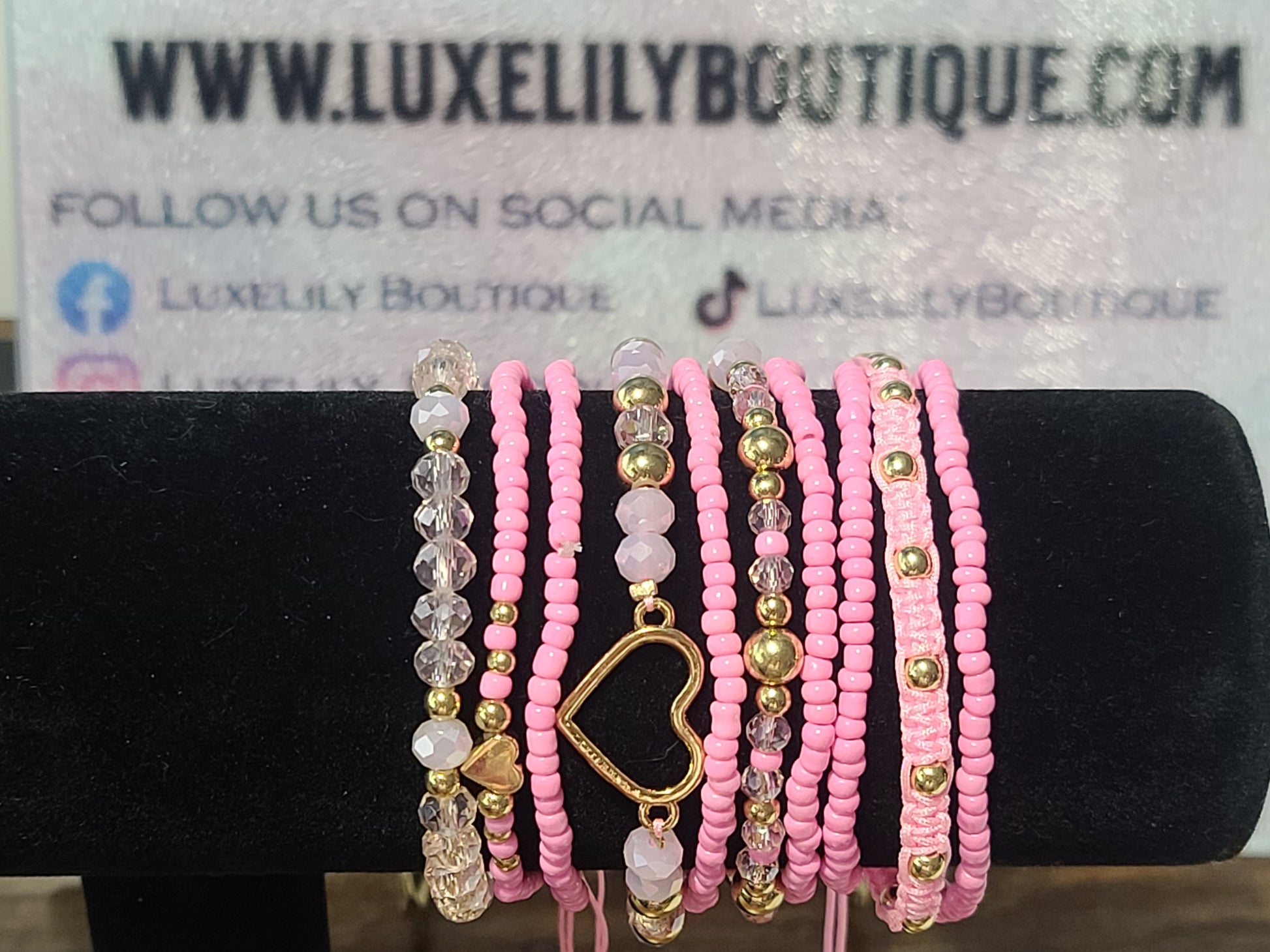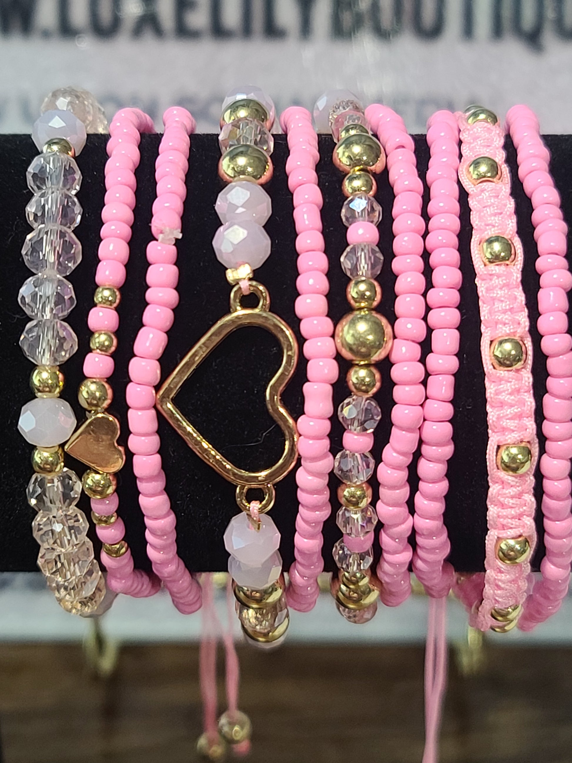 Add a touch of charm and elegance to your everyday style with this 10-piece pink heart glass beaded bracelet set. Designed for those who love cute, feminine, and stylish accessories, each bracelet is handcrafted with soft pink glass beads and accented with luxurious gold details for a delicate yet eye-catching look.