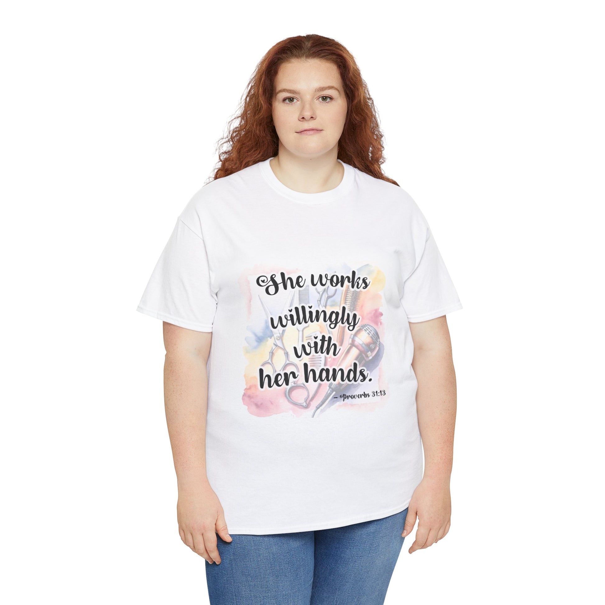 Celebrate your artistry and dedication with our “She Works Willingly with Her Hands” Proverbs 31:13 Ladies' T-Shirt, designed specifically for hairstylists and cosmetologists. This unisex heavy cotton tee is a wardrobe essential, serving as the perfect foundation for your casual fashion.