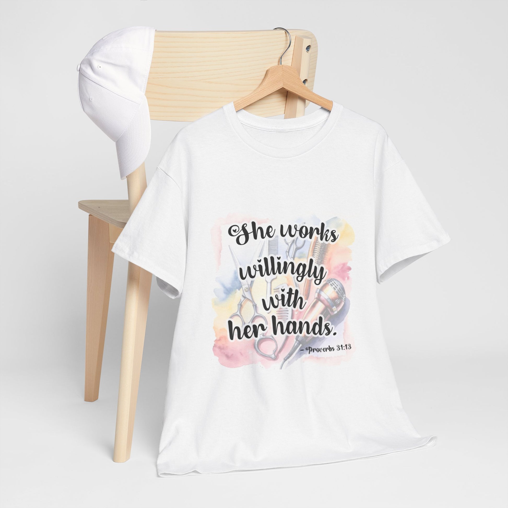 She Works Willingly with Her Hands Proverbs 31:13 Ladies' T-Shirt for Hairstylists and Cosmetologists
