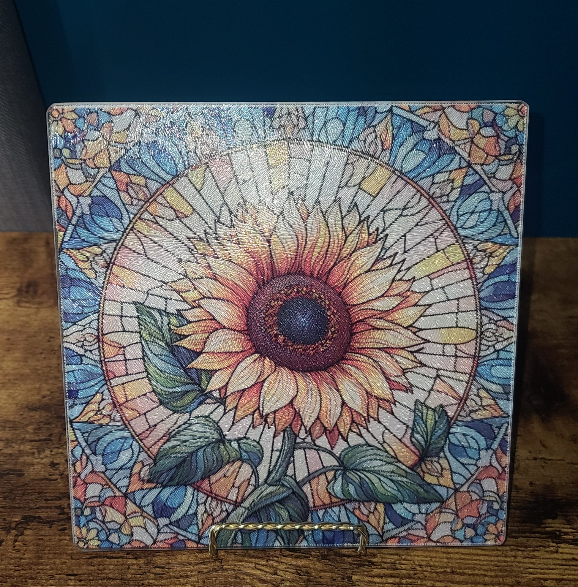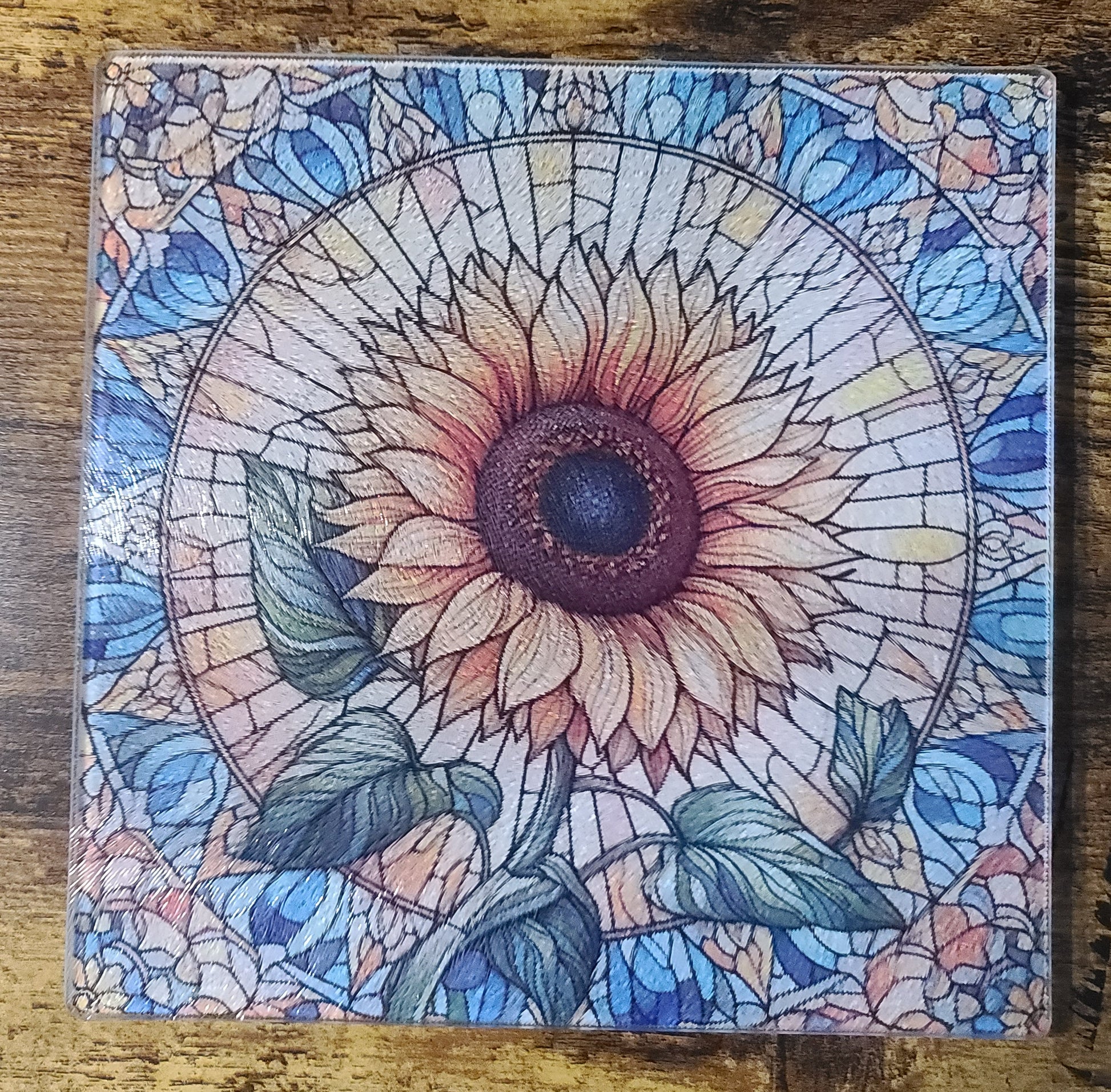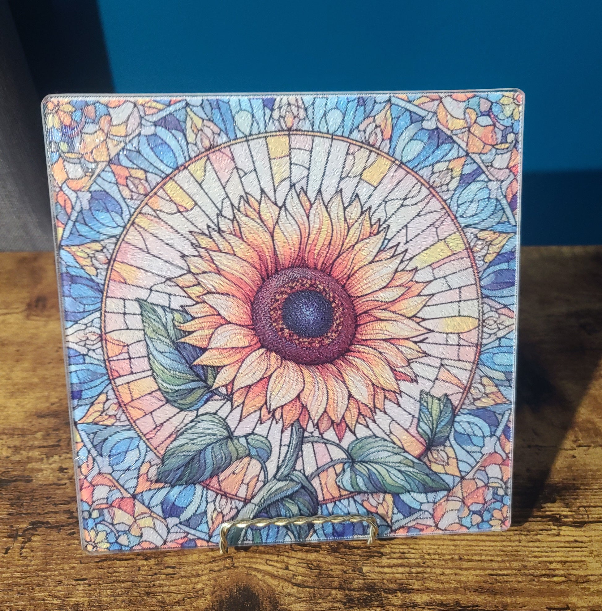 Add a touch of inspiration and beauty to your kitchen with this handmade Sunflowers Square Glass Trivet/Cutting Board with a stained glass look. Measuring 7.75 x 7.75 inches, this unique piece features a sublimated design showcasing vibrant sunflowers, perfect for those who appreciate both beauty and meaning in their home decor. Can also place in a window on a plate stand for window decor or in front of a small light, as in the main image. Can also be used as a small cheese tray if desired.