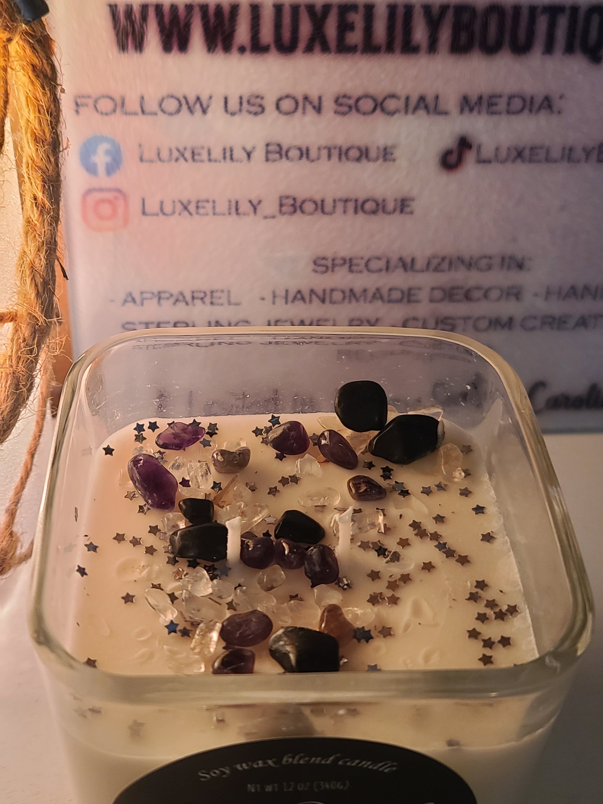 ✨ Amethyst Crystal Candle for Serenity & Meditation – Known for its healing and calming properties, amethyst supports peaceful energy, emotional balance, and mindfulness practices.