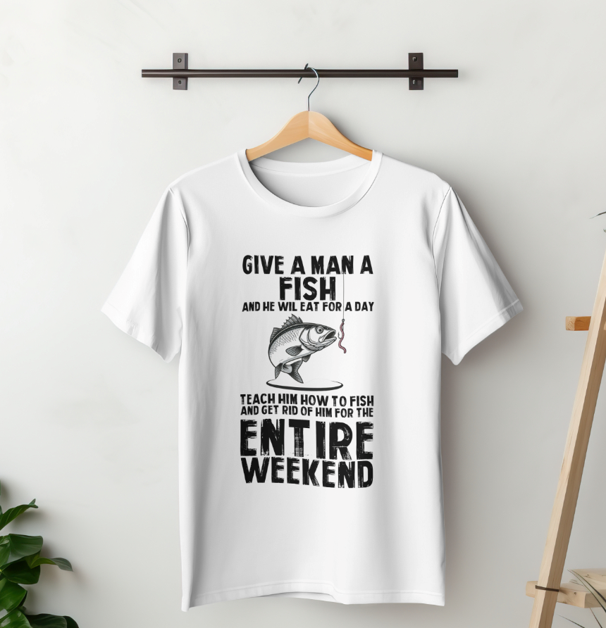 This witty graphic tee is the perfect blend of humor and outdoor spirit. Featuring the classic proverb "Give a man a fish, he will eat for a day.......," this shirt is sure to spark conversations and bring a smile to any angler's face. Whether you're an experienced fisherman or just a weekend warrior, this shirt is a must-have for your wardrobe.