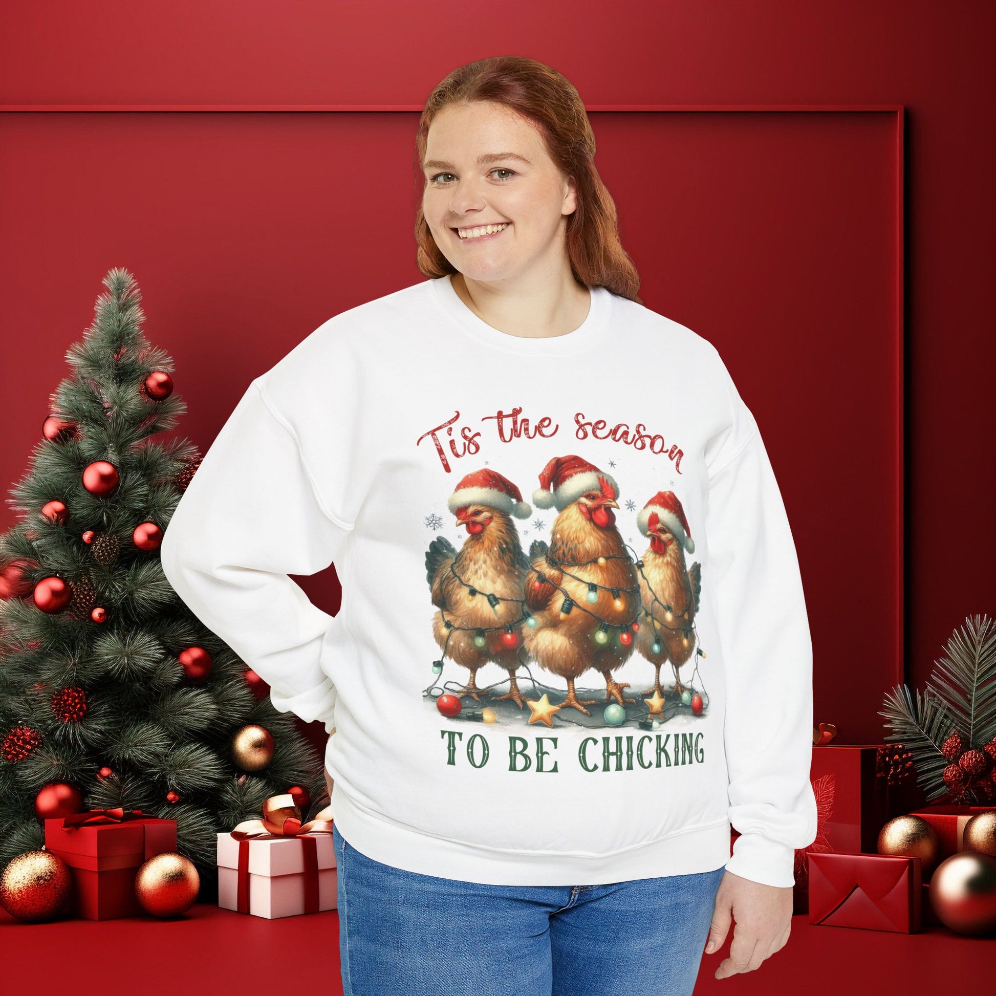 This vintage look Christmas sweatshirt is perfect for chicken lovers who want to get into the festive spirit. It's cozy, soft, and ideal for snuggling up with a warm drink during the holiday season. The 'Tis the Season to be Chicking' slogan makes it a great gift for anyone who loves chickens or unique holiday apparel. Perfect for the winter season and holiday celebrations.