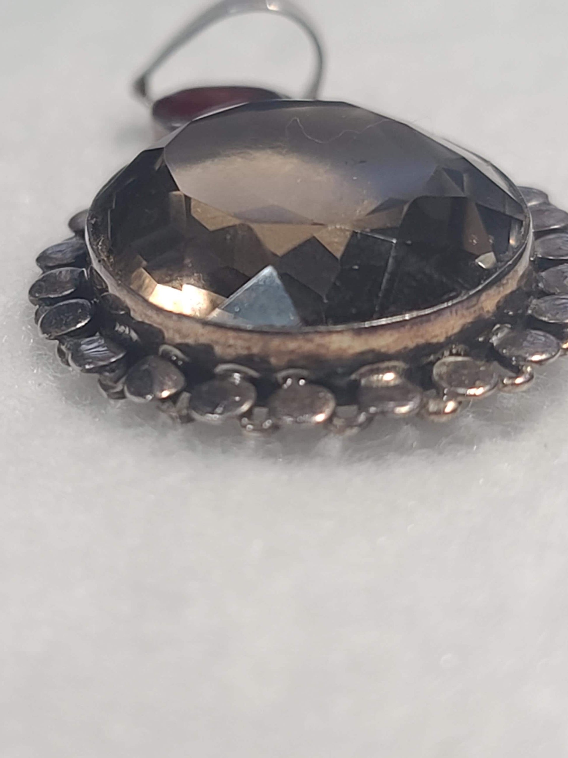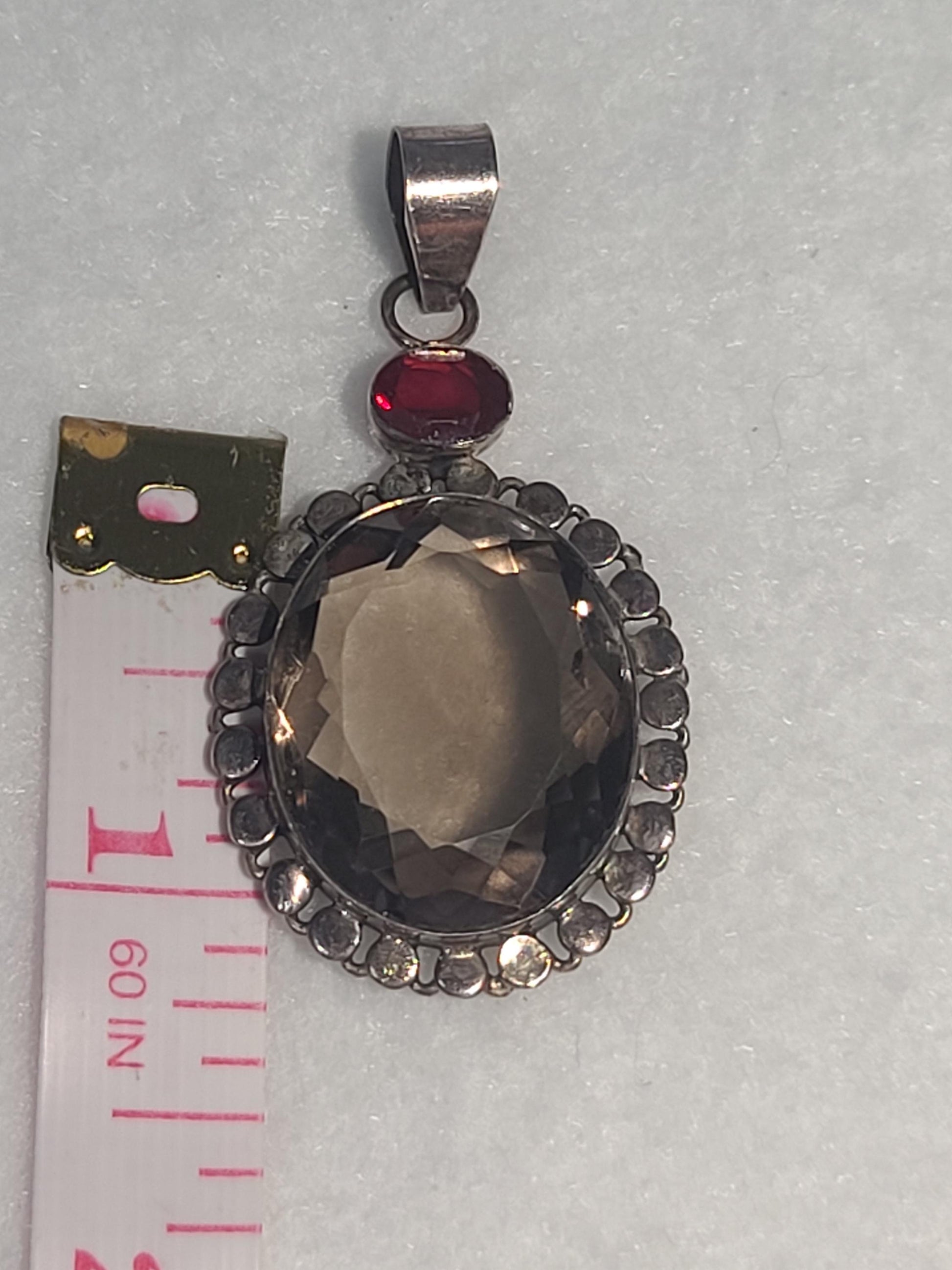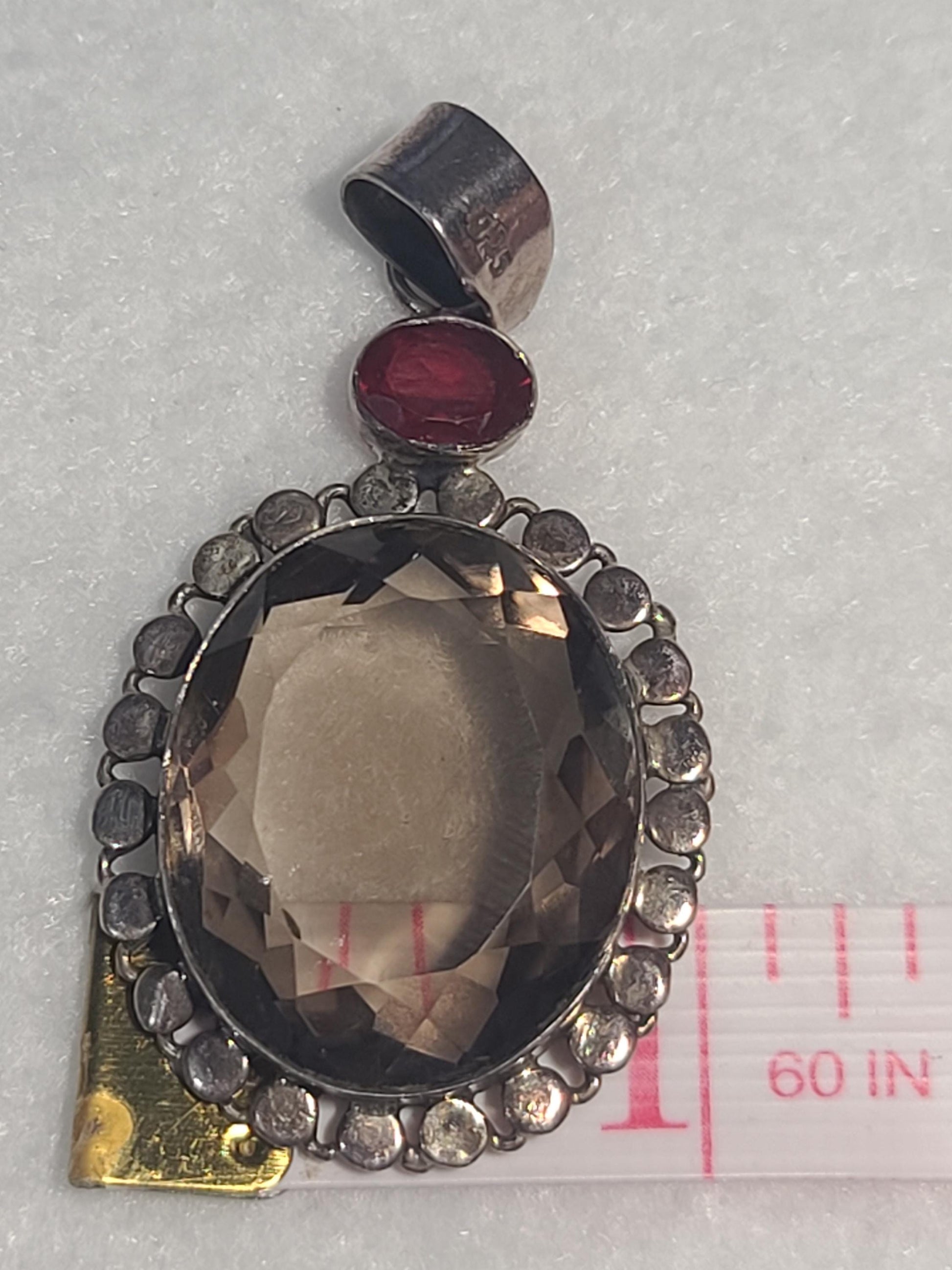 Explore the charm of this unique Antique Pendant, an estate sale find that showcases the beauty of handcrafted artistry. This piece features a stunning combination of smoky quartz and garnet stones set in sterling silver, making it a captivating addition to any jewelry collection.